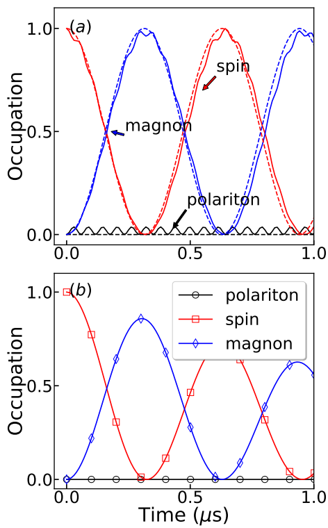 一方面,磁振子用于实现量子信息处理和量子计算,首要任务就是将磁振子与量子比特(二能级系统)远距离耦合起来。固态金刚石中的氮空穴色心自旋具有良好的可控性、集成性和相干性,因此被认为是最有潜力的量子系统之一。现有的自旋-磁振子强耦合方案都存在一个共同的缺陷:自旋与磁振子距离太近,从而导致操控磁振子时必然会引起自旋比特的退相干。鉴于此,我们首次提出利用多模光力系统作为混合量子界面来实现远程自旋与磁振子的强耦合。我们是把自旋和磁振子分别放置在由机械振子连接起来的两个微波腔中。通过调控系统参数,将机械振子自由度绝热消除掉,进而引入双腔之间的位置耦合和双模压缩效应。当操控系统到压缩表象后,自旋(磁振子)与微波腔中的光子以及双腔中的光子之间的耦合强度都将被指数提高,从而产生了耦合腔模的极化激元。当双腔耦合强度达到临界值时,该极化激元中的低频分支具有临界效应,可以用来实现自旋(磁振子)与低频极化激元的强耦合。利用大失谐条件,低频极化激元处于虚激发状态,进而诱导出自旋与磁振子的强耦合。该工作于2023年3月30日在线发表在理论物理国际主流期刊 Physical Review A上 【Wei Xiong, Mingfeng Wang, Guo-Qiang Zhang, and Jiaojiao Chen,Optomechanical-interface-induced strong spin-magnon coupling, Phys. Rev. A 107(3),033516 (2023)】。3044永利熊伟博士为第一作者兼通讯作者。此项研究得到了国家自然科学基金、安徽省自然科学重点项目支持。