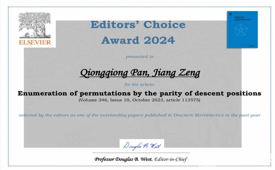 近日,公司数学公司潘琼琼博士以及法国里昂第一大学曾江教授的科研成果“Enumeration of permutations by the parity of descent positions”被《Discrete Mathematics 》(DM)期刊入选为“Editors’ Choice Award 2024”(由期刊主编从期刊中一大批高质量论文中选出,并由专门的评审委员会评判并赞扬其高影响力,并在DM期刊的社交媒体渠道对该文章进行宣传),目前该文章在https://doi.org/10.1016/j.disc.2023.113575上免费对读者开放至2025年3月31日。