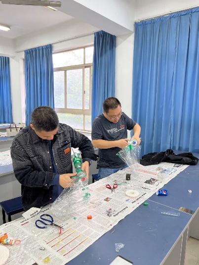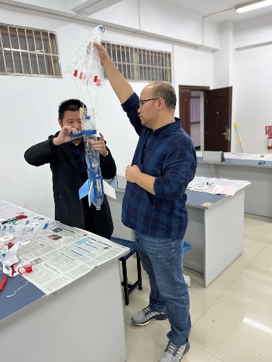 下午的实验制作更是精彩,结合STEM理念制作了水火箭,在给学员介绍制作方法时,着重强调了安全事项,之后带领大家到户外发射水火箭检验效果。