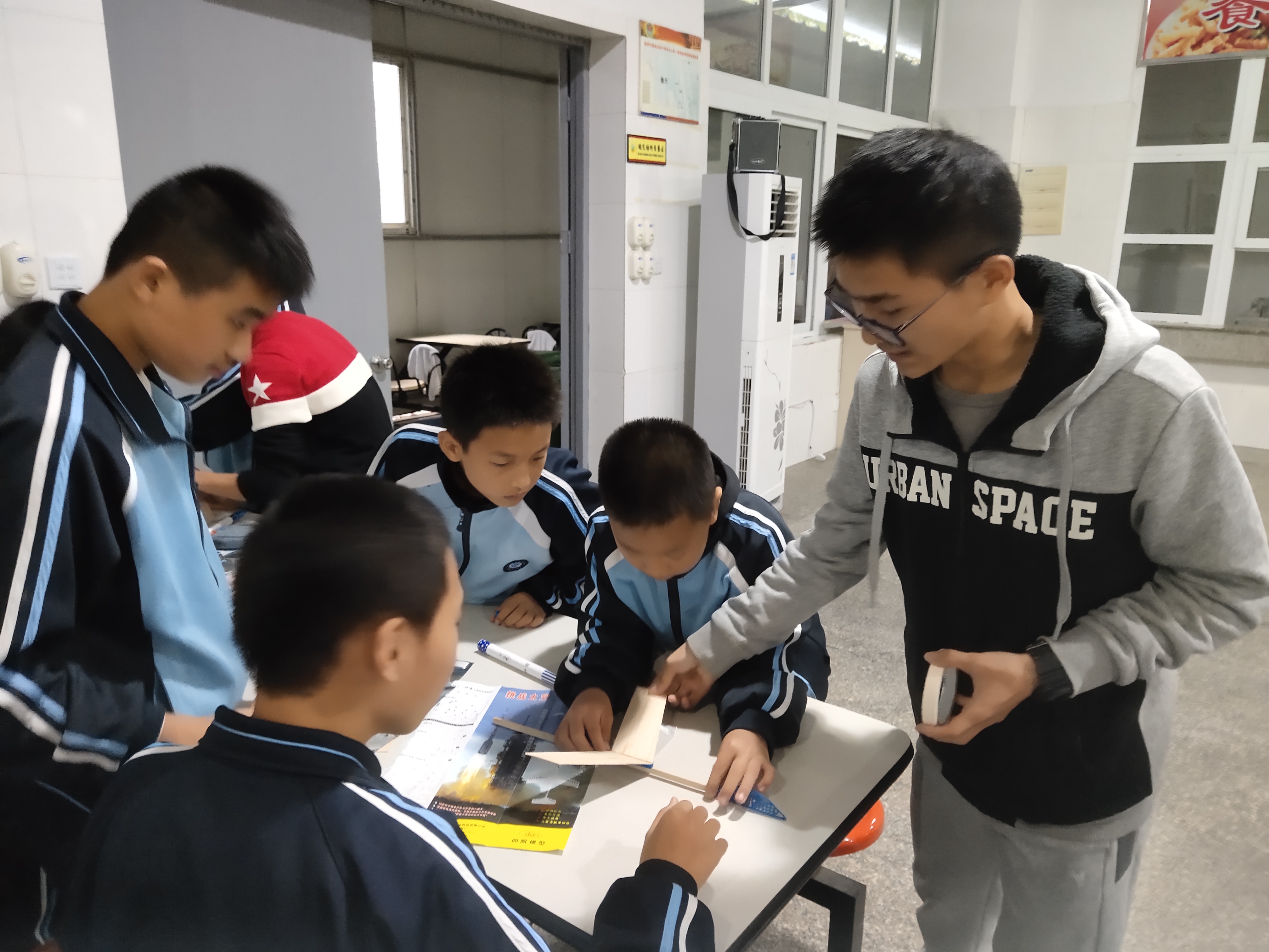 鹿城实验中学七年级240余名同学有序入座,认真聆听讲解员的介绍。由于制作环节需要用到502速干胶水、剪刀等物品,讲解员着重强调了“安全”问题。分发材料后,制作小飞机环节就开始了。一名讲解员用话筒主讲,老师与其余七名讲解员穿梭在同学中一一进行具体指导。