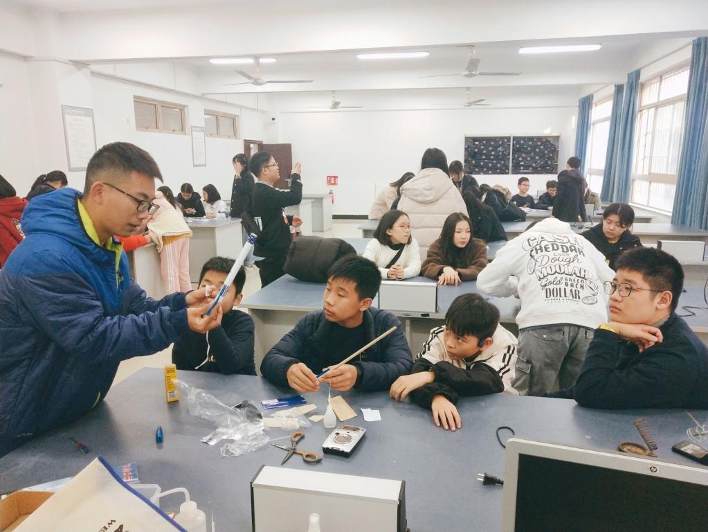 12月10日下午2:30,绍兴博雅国际公司的同学们参观了3044永利实验楼内的展示厅,老员工们的讲解和演示为他们打开了物理的大门。下午3:30,同学们每三个人组队,领取已经切割打磨好的材料包。之后,老师在旁讲解理论,讲授火箭的制作方法和滑翔机的调试方法,为同学们明天的制作和发射做准备。