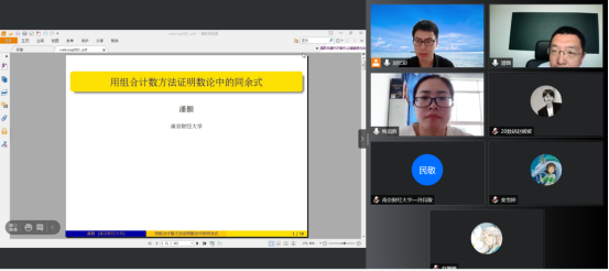 2021年6月4日下午,南京财经大学潘颢教授应邀在线上作了一场题为“用组合计数方法证明数论中的同余式”的学术讲座,报告会由数学系刘纪彩老师主持,数学系梅周胜老师,潘琼琼老师,统计与信息科学系齐豪老师,以及数学系部分研究生参加了这场学术报告。