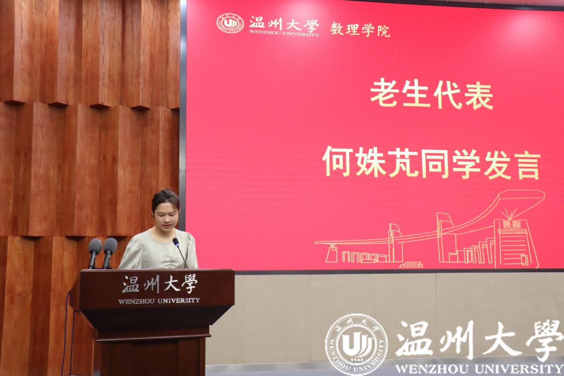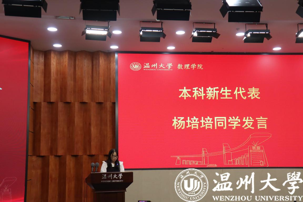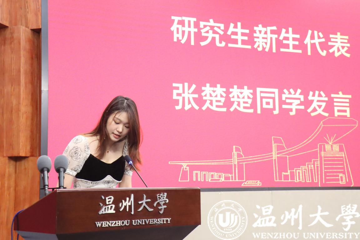 新生代表发言环节,研究生新生代表张楚楚同学和本科新生代表杨培培同学依次上台发言,她们分享了自己成为温大人的自豪与责任。21信算杨培培同学是21级新生中年纪最小的,完成报道手续后便以十足的热情投入到志愿者工作中。她们表示,在未来的日子里必将坚定理想信念,培育高尚品格,练就过硬本领,勇于创新创造,矢志艰苦奋斗,谱写新时代的青春之歌。