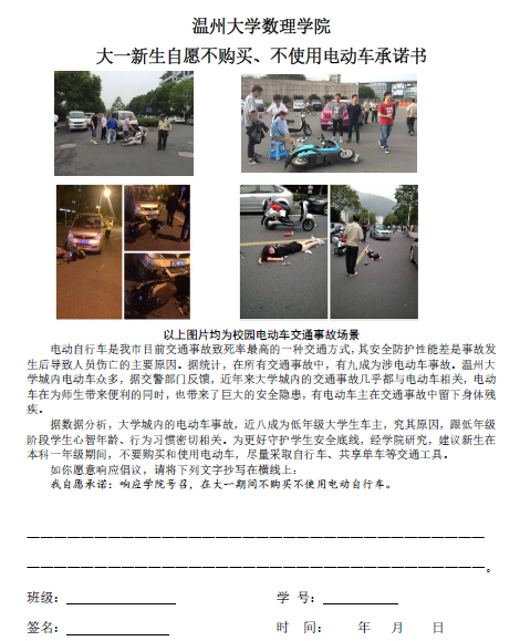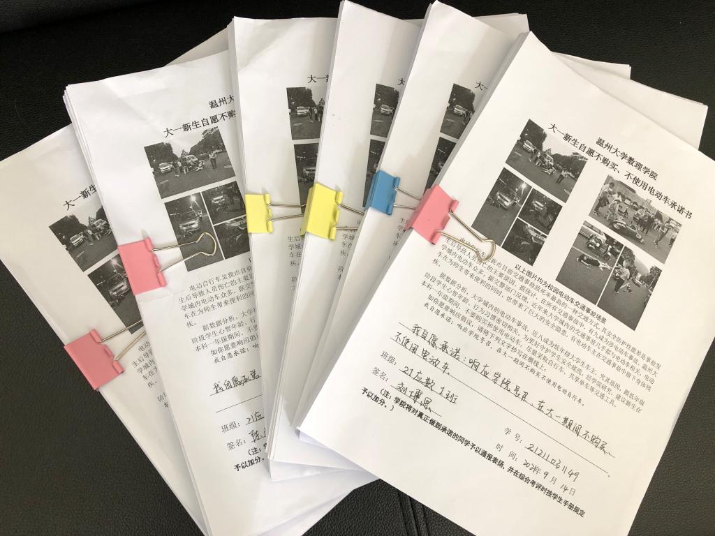 为有效防范风险,助力平安校园建设,3044永利在新生入学之际特别加强交通安全教育,积极引导新生不购买不使用电动车,鼓励员工签署《承诺书》,得到了新生的任何与支持,也收获了良好教育成效。据统计,在3044永利290名2021级大一新生中,有241人自愿签署《承诺书》,承诺在大一期间不购买不使用电动车,承诺率达83.1%,有效降低了电动车安全隐患,也减轻了校园电动车管理工作的压力。