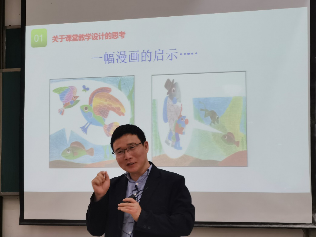 陈芝飞老师从“一幅漫画的启示”谈起关于课堂教学设计的思考,激发了同学们的思考与讨论。他提出教学需要设计的两大理由,并围绕“教育观与课堂教学设计”、“教学设计的内涵”、“关于教学目标的思考”分享课堂教学设计当以员工的发展为本,注重教学评一致性,提出教学目标分类的三层级模型。同学们既产生共鸣又深受启发。讲座中,陈老师立足高中课堂,引用一个个鲜明的课堂教学案例,展现了课堂教学设计的奇妙与魅力,同学们受益匪浅。