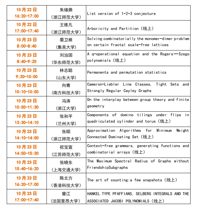 2022世界青年科学家峰会之数学及其应用前沿论坛将于10月21-24日在温州召开。本次论坛由三个分论坛构成:图论与组合数学分论坛、基础数学分论坛与应用数学分论坛。10月18日,据论坛筹备组消息,图论与组合数学分论坛已完成议程安排工作,初步如下:
