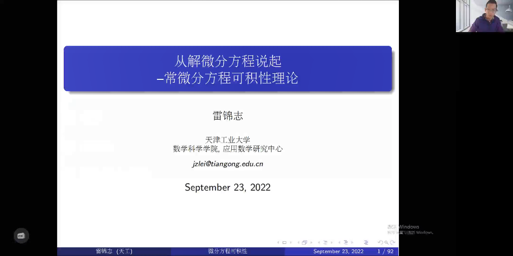 2022年10月13日上午,天津工业大学雷锦志教授应邀在线作了题为“从解微分方程说起——常微分方程可积性理论”的学术报告。这场报告会由王子子博士主持,于恒国、胡亦郑与黄琼伟等老师,及数学系、统计系部分研究生以及线上其他公司的师生参加了这场学术报告。