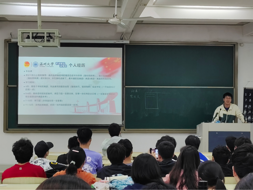 章志图老师鼓励大家向优秀学长学习,希望低年级同学们要更加注重学业,学号专业知识,为以后的考研或就业打好专业基础。他还表示,同学们要清醒认识当下社会各行各业的用人需求,明确自身的目标方向,努力通过学习、考研提升自己的竞争力,在毕业时有更好的择业选择。