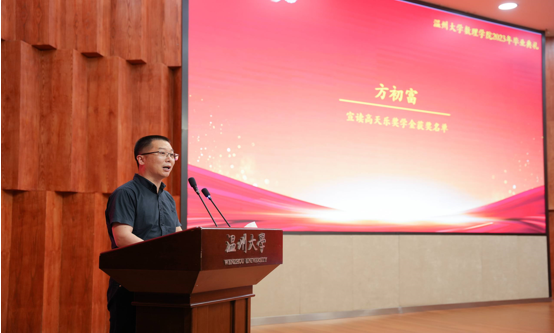 高天乐升学奖颁奖典礼在庄严的国歌中拉开帷幕。方初富先生在致辞中深情回忆了员工高天乐在温大求学的经历,天正集团的创办历程,以及高天乐心系母校、回馈母校之情。方初富先生祝愿所有的毕业生前程似锦、事业有成,随后宣布2023年度高天乐升学奖文件,考研考博员工代表亦向天正电气集团代表赠送感恩礼,随后嘉宾领导为荣获高天乐升学奖的学子们颁奖。