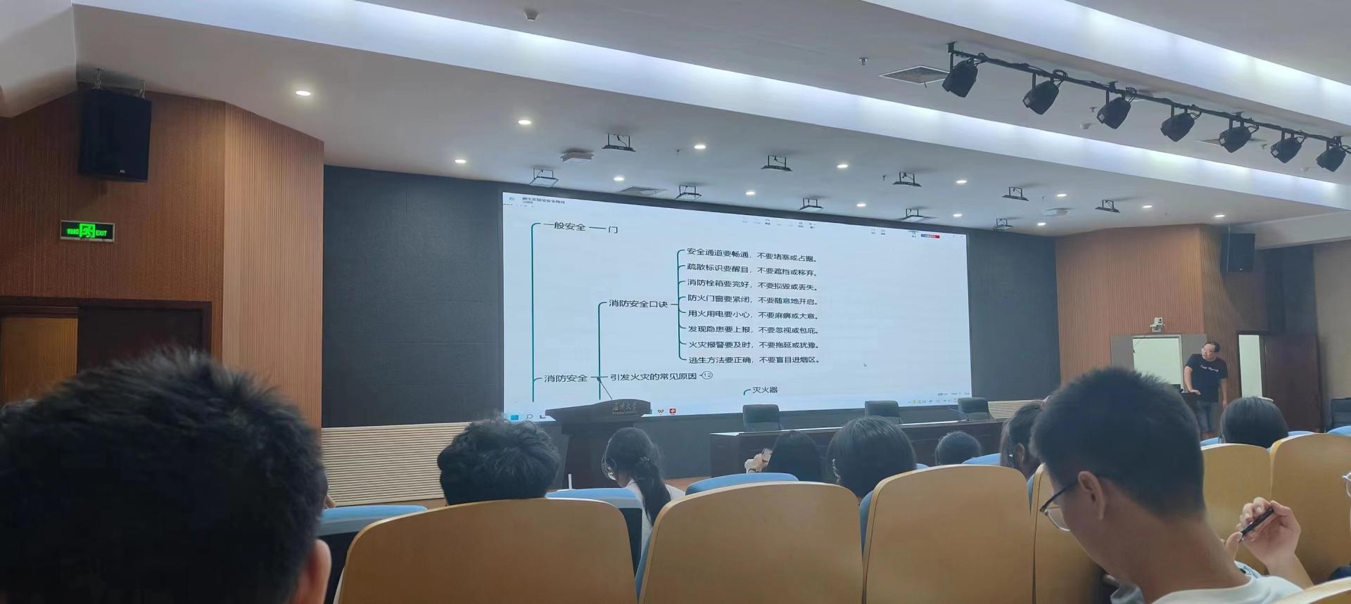 王振国老师就“我是谁”“导入”“安全两件事”“特别强调”“考试说明”五个部分展开讲座。在“我是谁”环节,王老师将个人联系方式办公地点等详细信息向所有新生公开,并欢迎同学们就各种问题前来咨询。导入环节,王老师着重强调了实验室安全的重要性和必要性,特别是强调了规则意识,在新生入学伊始,便建立起对实验室安全工作的规则意识和重视度。“安全两件事”环节,王老师从安全知识和安全意识两个维度展开,对实验室的潜在风险源、安全设施的使用进行了介绍。在安全意识部分,强调了“时时想安全、事事讲安全”、“安全责任,人人有份”“一动念,先安全”的理念。在丰富的安全知识介绍后,王老师又特别强调了几条重要事项。最后,就实验室安全准入考试工作进行了布置。