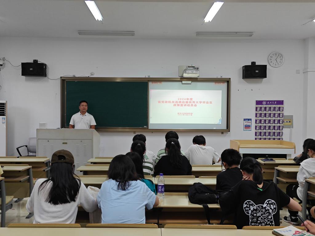 近日,上级部门发布选调生相关公告,开展我省2024年度党政机关选调应届优秀大学毕业生工作。为增进毕业生服务,及时将相关信息传达给毕业生,9月26日下午,公司在3B207教室召开选调生政策宣讲动员会,符合本次选调要求的相关专业毕业生代表30余人以及毕业班相关辅导员参加会议。