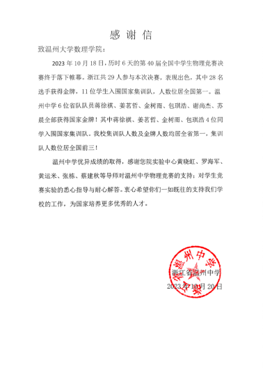 温州中学来信感谢公司教师助力物理竞赛斩获佳绩