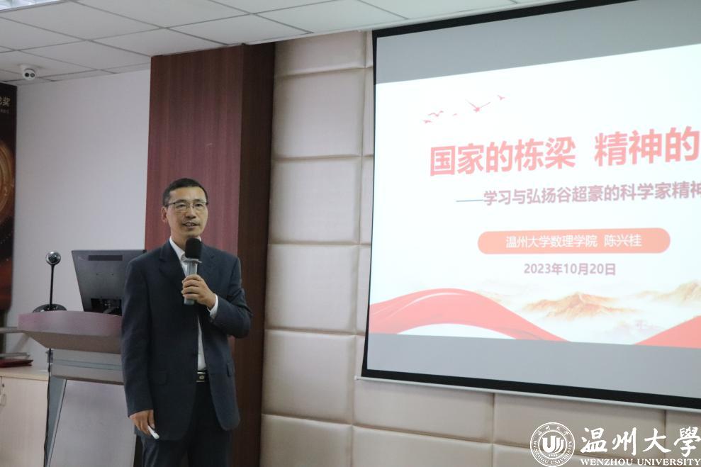 在这堂主题为《国家的栋梁 精神的丰碑》的专题党课中,陈兴桂老师从“为什么弘扬谷超豪精神”“谷超豪灿烂的一生”“科学家精神的践行者”三个层面展开宣讲,通过讲述谷先生的故事,积极弘扬科学家精神和教育家精神。作为科学家,谷先生解决了杨-米尔斯方程的Cauchy问题,Minkowski空间中极值曲面的构作问题,开创了波映照的研究,获得了国家最高科学技术奖。此外,谷先生还培养出李大潜、洪家兴、穆穆、陈恕行等中国科公司院士6人、中国工程院院士3人,也是名副其实的教育家。