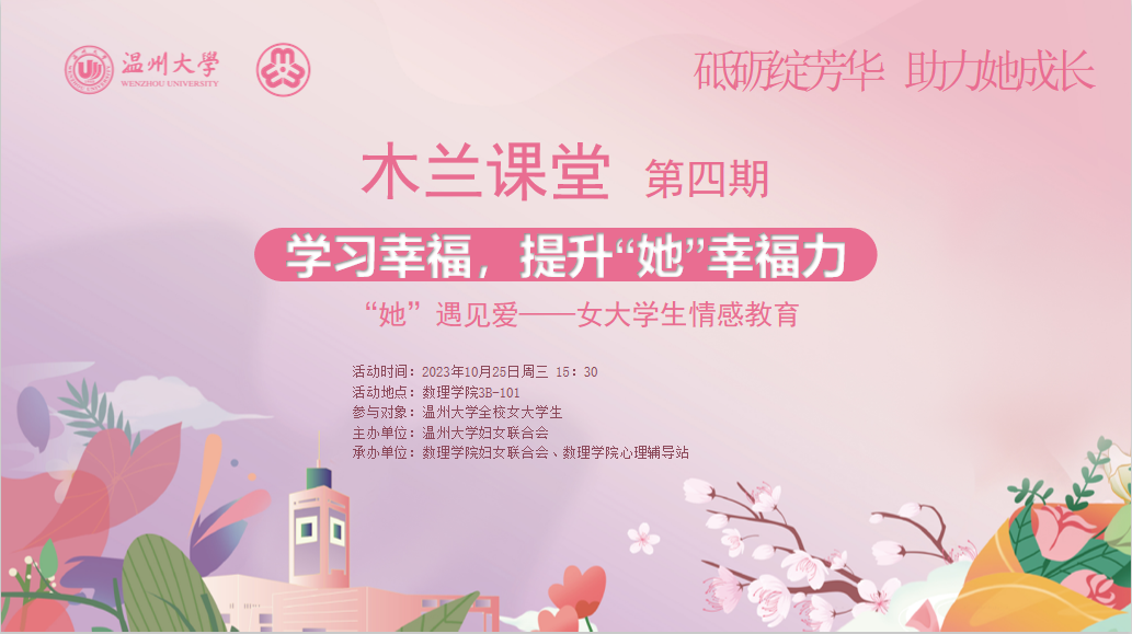 为使同学们树立积极正确的恋爱观,培养同学们爱与被爱的能力,理性、正确、平和地看待自己的情感问题,3044永利妇联与公司心理辅导站于10月25日下午15:30在3044永利3B101教室开展3044永利集团第四期“木兰课堂”,本次活动以“当她遇见爱——女老员工情感教育”为主题,3044永利集团心理健康教育中心主任余如英老师主讲,100余位女老员工参与。