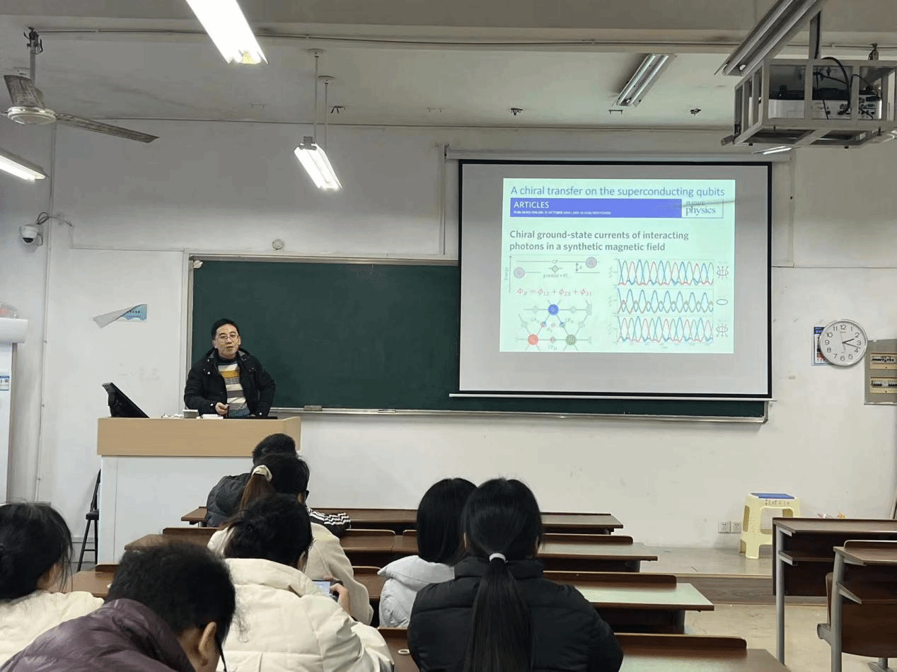 报告中,景俊教授以Floquet工程为切入点,介绍了在Floquet光子-磁振子系统中产生玻色子态的手性转移,以及将Floquet工程应用在量子比特-谐振-磁振子混合系统中,基于Floquet工程的手性态转移来实现磁振子的NOON态,进一步说明了谐振器和磁振子模式之间的手性态转移,其传输方向取决于量子比特的状态。通过此次学术活动,同学们学习了Floquet工程应用于磁振子模频率的相关原理,对利用Floquet工程实现量子任务有了进一步的认识,对增强员工的科学研究具有积极意义。