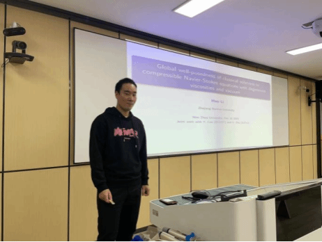 为促进学风建设,拓展师生视野,浓厚科研氛围,公司自2020年开始建设“数理大讲堂”平台,定期邀请校外专家学者来校交流。2023年12月18日上午,应公司邀请,浙江师范大学李浩博士在公司3B301教室作题为《Global well-posedness of classical solutions to compressible Navier-Stokes equations with degenerate viscosities and vacuum》的学术报告。本次学术报告是2023年第43期“数理大讲堂”活动,由公司杜利怀博士主持。