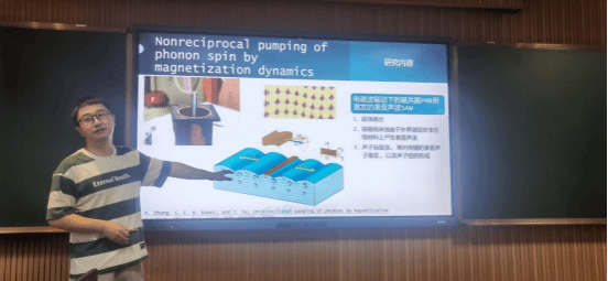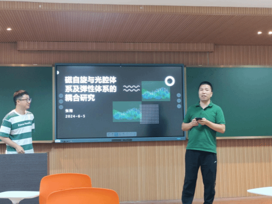 主题会议上,张翔老师以磁自旋与光腔体系及晶格弹性(声子)的相互作用为切入点,详细介绍了铁磁纳米线(YIG)由电磁波驱动下在声学底衬材料上激发产生表面声波(SAW)的物理机制,基于此设计得到了单向声子自旋流、单向声子激发以及声子腔,其次报告了波导中磁子与光子的手性耦合特征研究,以及分析了基于Dicke模型的量子电池当中的加速充电效应。并进一步提出将磁弹耦合纳入二维反铁磁薄膜热弹动力学。通过此次会议,同学们学习了磁弹耦合的相关原理,对磁机械系统有了进一步的认识。在讲座临近尾声之时,在场师生与张翔老师进行了积极的互动。本次讲座的顺利开展,开拓了老师和员工们的学术视野,对提高员工的科学研究具有重要的意义。
