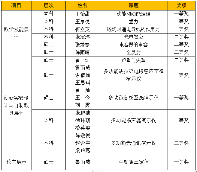 本届大赛由罗海军老师作为领队,黄晓虹、罗海军老师作为团队指导教师,集体为21物理的本科生、22和23的学科教学(物理)研究生进行教学技能、创新实验设计和论文展示等三方面的辅导。本科组中,黄晓虹老师指导的21物理的王荩悦、丁怡甜、何立英三位同学获得教学技能一等奖,张宸玮同学获得教学技能二等奖;罗海军老师指导的22物理的张鹏浩、徐玮琪、潘英姿组获得教具创新实验设计一等奖,22物理的陈敬悦、赵含宇、梁玲燕组获得教具创新实验设计二等奖。研究生组中,黄晓虹老师指导的张婷婷、陈雨晴、黄灿三位同学获得教学技能二等奖;罗海军老师指导的鲁雨成、谢倩如、王思琪组和黄灿、王今、刘露组均获得教具创新实验设计一等奖;罗海军老师指导的研究生鲁雨成获得论文展示一等奖。