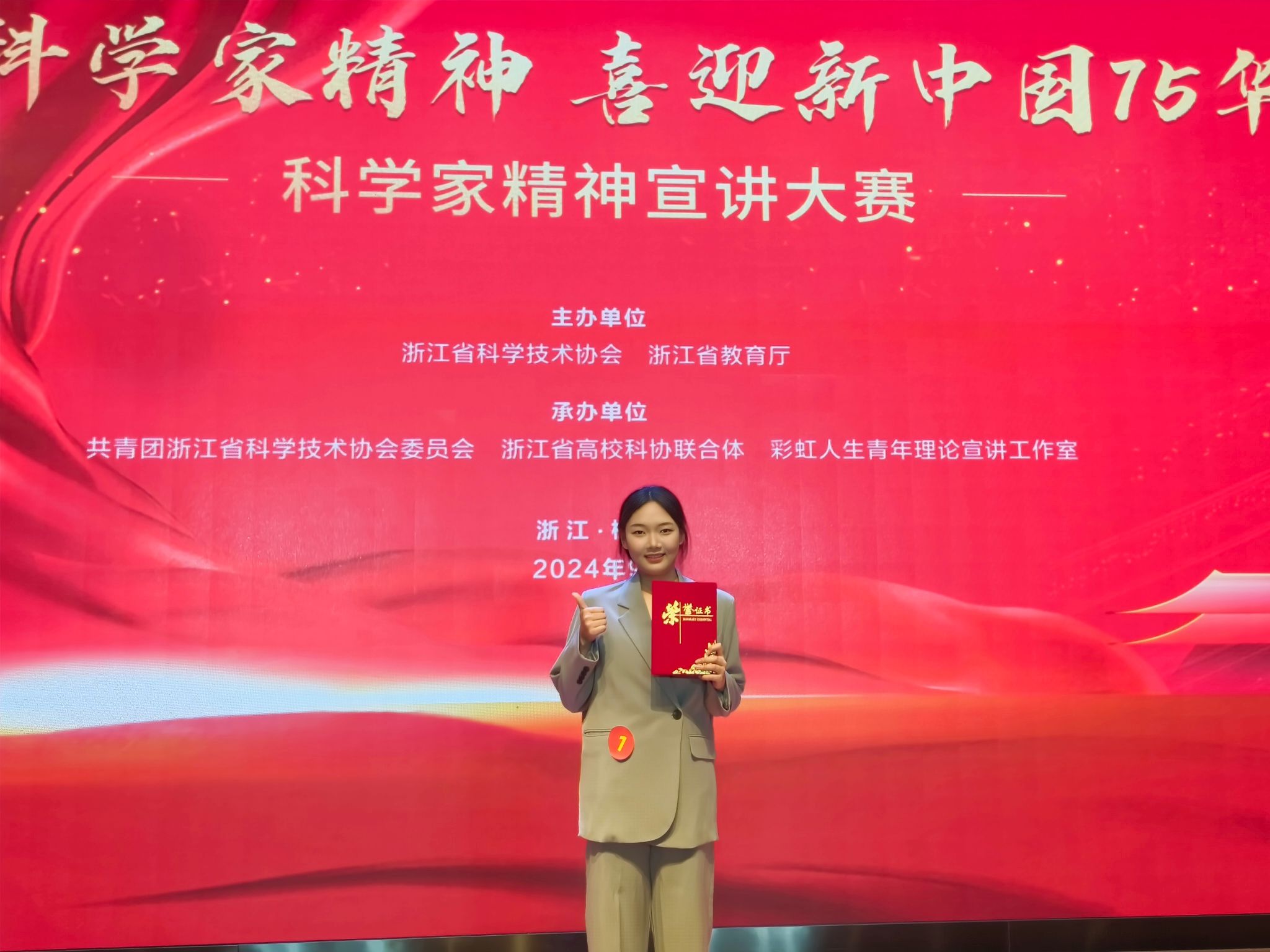为庆祝新中国成立75周年,进一步弘扬科学家精神,激发广大科技工作者和青年学子的爱国情怀与创新热情,2024年9月29日,由浙江省科学技术协会、浙江省教育厅主办的“传承科学家精神,喜迎新中国75华诞”科学家精神宣讲大赛决赛在杭州进行,公司23级物理(师范)张曼儿同学以《“材”之坚韧,“才”之培育——传承科学家徐祖耀精神》为题进行主题宣讲,并喜获银奖。