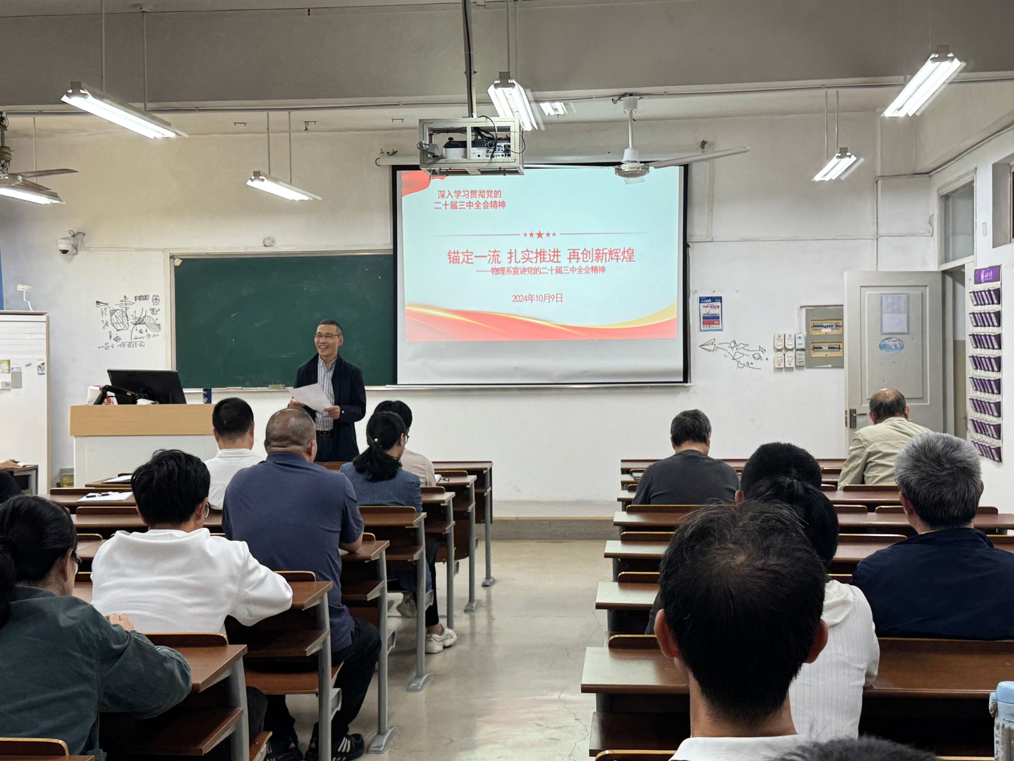 2024年10月9日下午,公司党委书记陈兴桂以“锚定一流 扎实推进 再创新辉煌”为主题在3B107教室面向物理系全体教师宣讲党的二十届三中全会精神,与教师们进行深入交流。