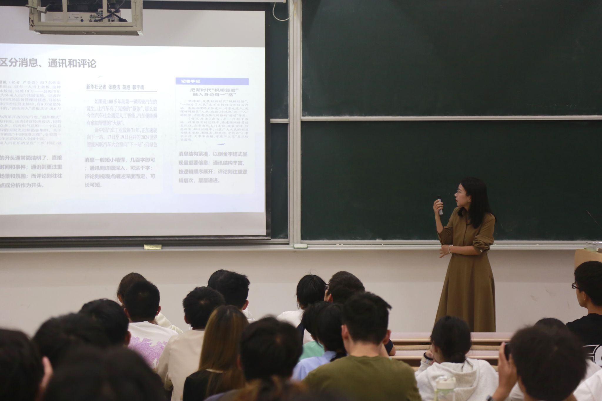 邓老师还指出了新闻写作中经常存在的问题,如领导列名的不妥、文章开头过于冗长、政策术语过分堆砌等不当之处。最后,邓老师更是坦言了自己作为新闻工作者的亲身体会,展示一些小妙招,提醒同学们利用好工具,学会用AI整理文稿框架,同时利用新闻学习平台掌握更多新闻热点和写作技巧,切实有效提高同学们的新闻报道写作能力。