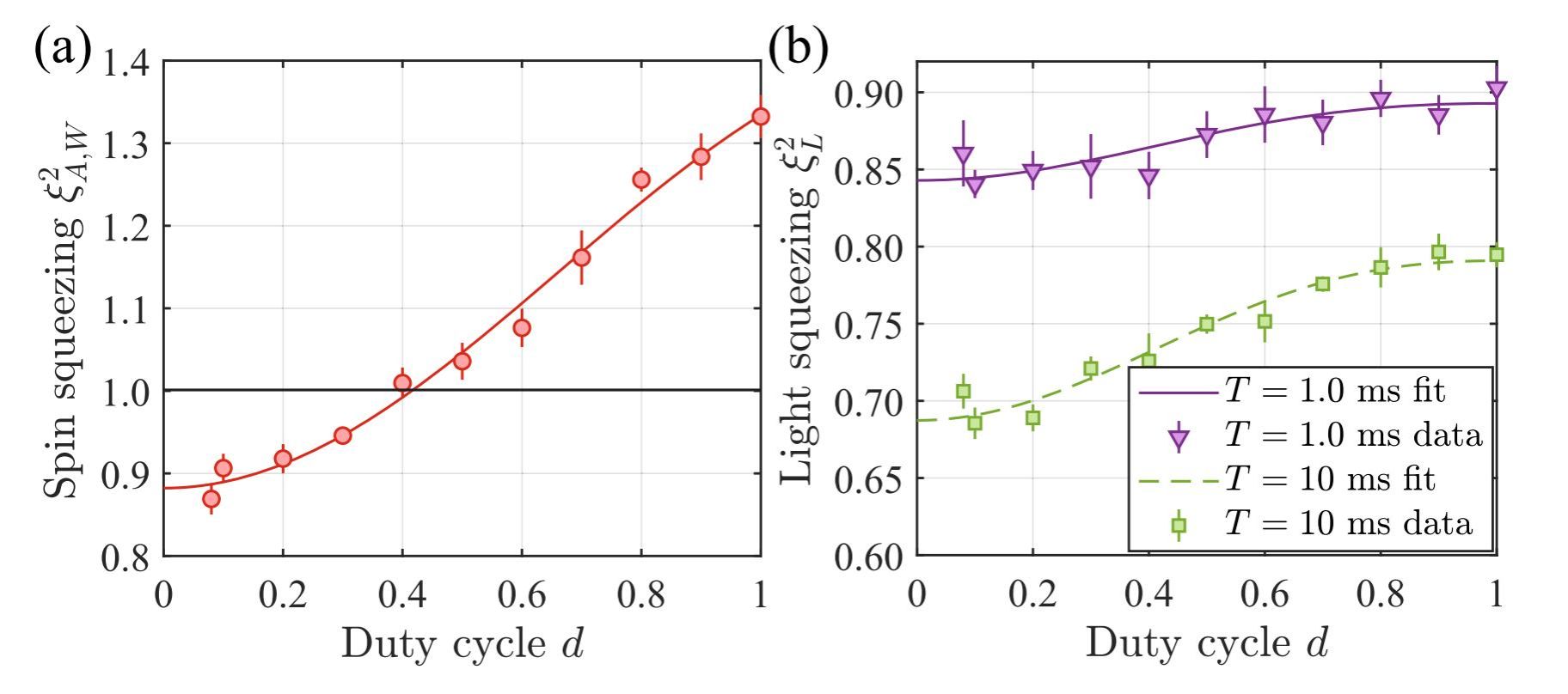 图2. (a) 原子自旋压缩度与脉冲占空比的关系图(占空比是指单个小脉冲长度与频闪周期的比值);
