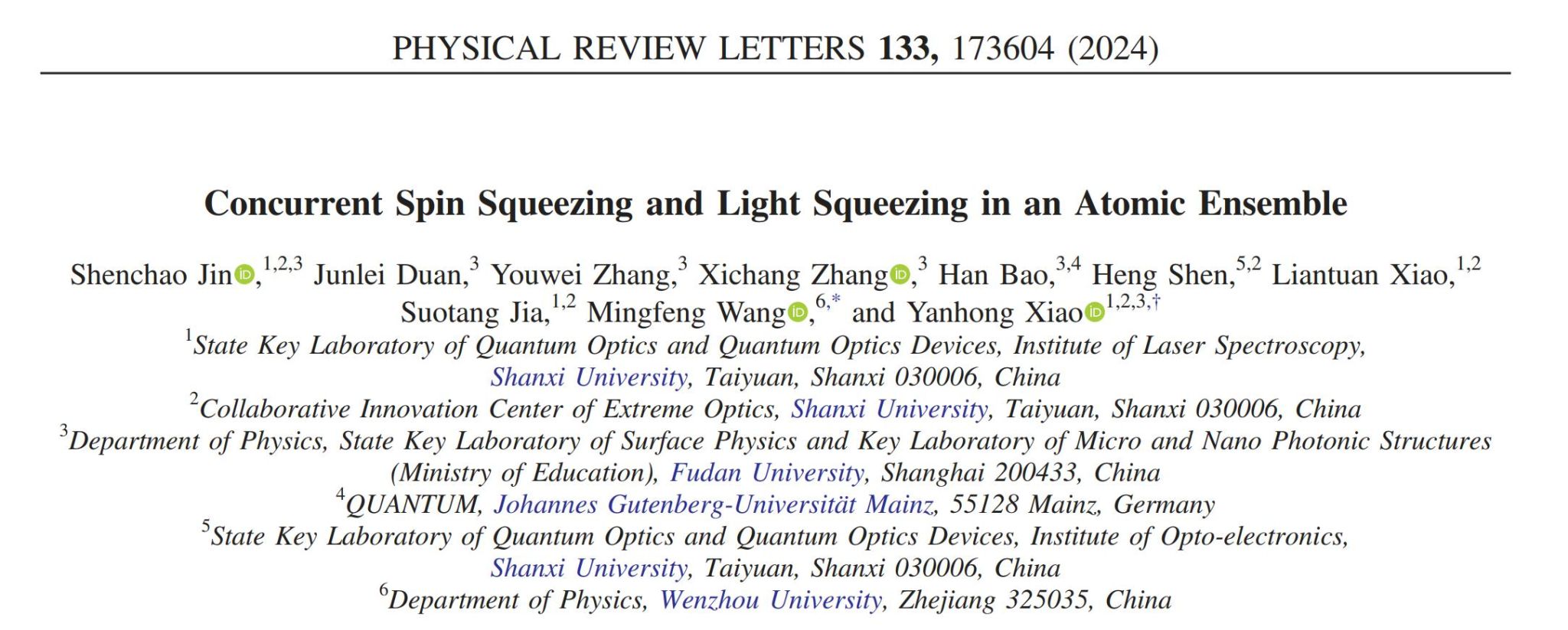 相关研究结果以题“Concurrent Spin Squeezing and Light Squeezing in an Atomic Ensemble”发表于近期的《Physical Review Letters》,公司3044永利王明锋副教授和山西大学肖艳红教授为论文共同通讯作者,博士生金沈超为论文的第一作者,山西大学贾锁堂教授、肖连团教授为该工作提供了重要指导,山西大学光电研究所申恒教授参与了研究。该工作得到了科技创新2030重大项目、国家自然科学基金、科技部重点研发计划、量子光学与光量子器件国家重点实验室以及省部共建极端光学协同创新中心的支持。