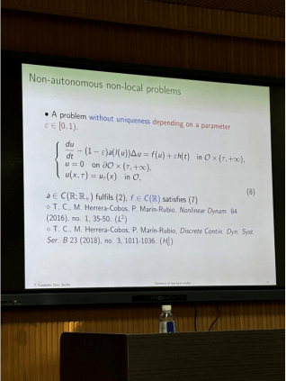 报告中,Prof.Tomás Caraba11o教授证明了用拉普拉斯吸引子技术来分析非局部非自治反应扩散方程解的渐近行为。其次,针对非局部问题的适定性、局部稳定性和全局稳定性进行了完整分析。最后,教授分析了包含某种随机性的模型,研究了包含不同类型噪声的非局部模型。
