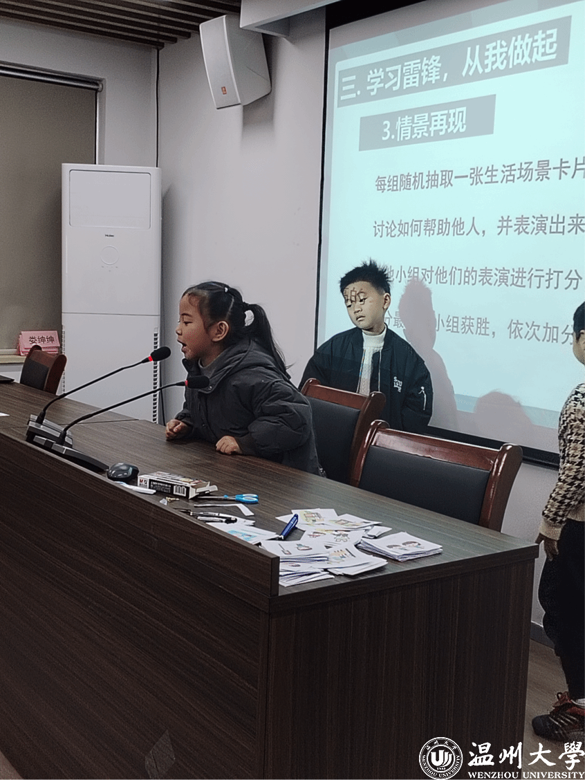 “情景再现”环节则是本次活动的又一亮点。张爽老师随机抽取生活场景卡片,小童馨们分组讨论如何像雷锋一样去帮助他人,并将讨论结果以表演的形式呈现出来。其他小组对他们的表演进行打分,现场气氛热烈而有序。在表演中,小童馨们充分发挥自己的想象力和创造力,将雷锋精神融入到了具体的情境中,仿佛雷锋就在他们身边,与他们一同行动。