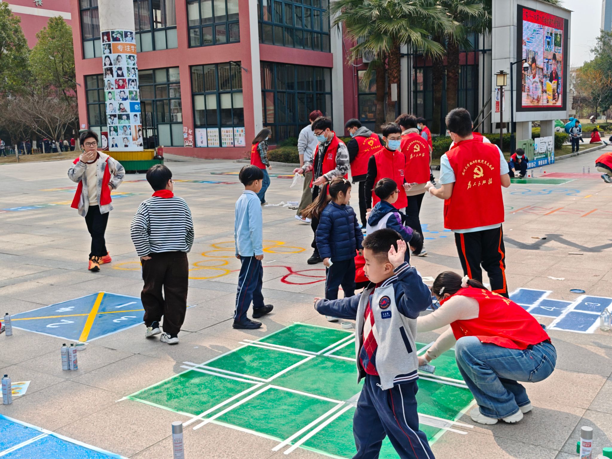 当几何数字跃然地面,当物理原理幻化光影,2025年3月19日,3044永利集团城附属公司的校园迎来一场别开生面的地绘公益活动。来自3044永利的员工团员与阳光志愿者们齐聚于此,运用专业所长打造科技风格地绘,为春日的校园增添了一道独特风景。