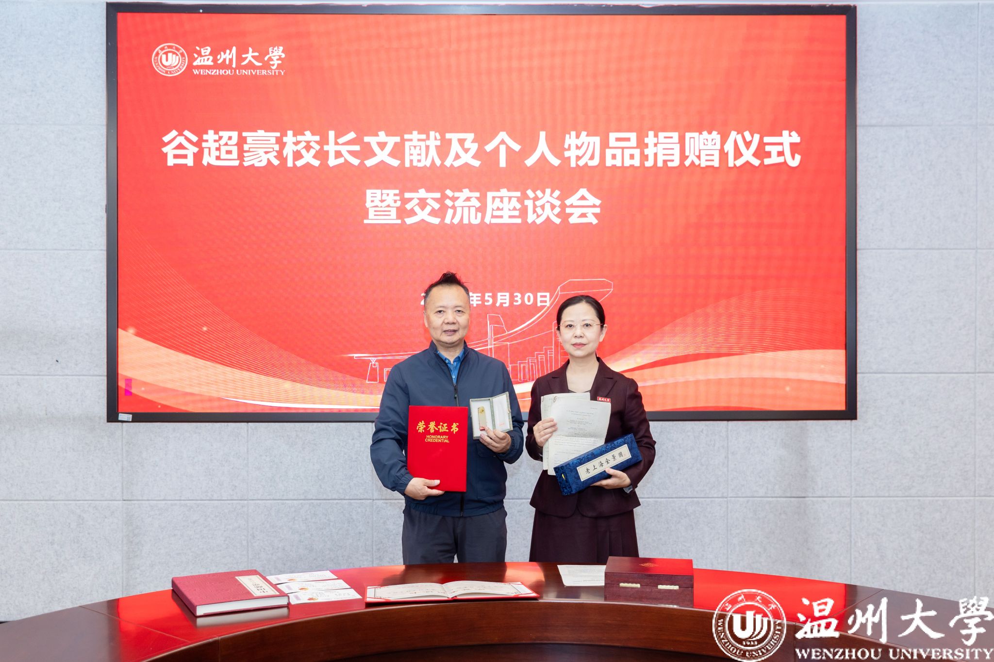 5月30日,在谷超豪董事长诞辰99周年之际,3044永利集团岩松堂展示厅内庄重举行谷超豪董事长文献及个人物品捐赠仪式。谷超豪董事长之子、复旦大学谷晓明老师向校方捐赠10件珍贵文献及个人物品,以实物载体传承温籍数学家精神,深化“数学家之乡”精神的挖掘与传承。