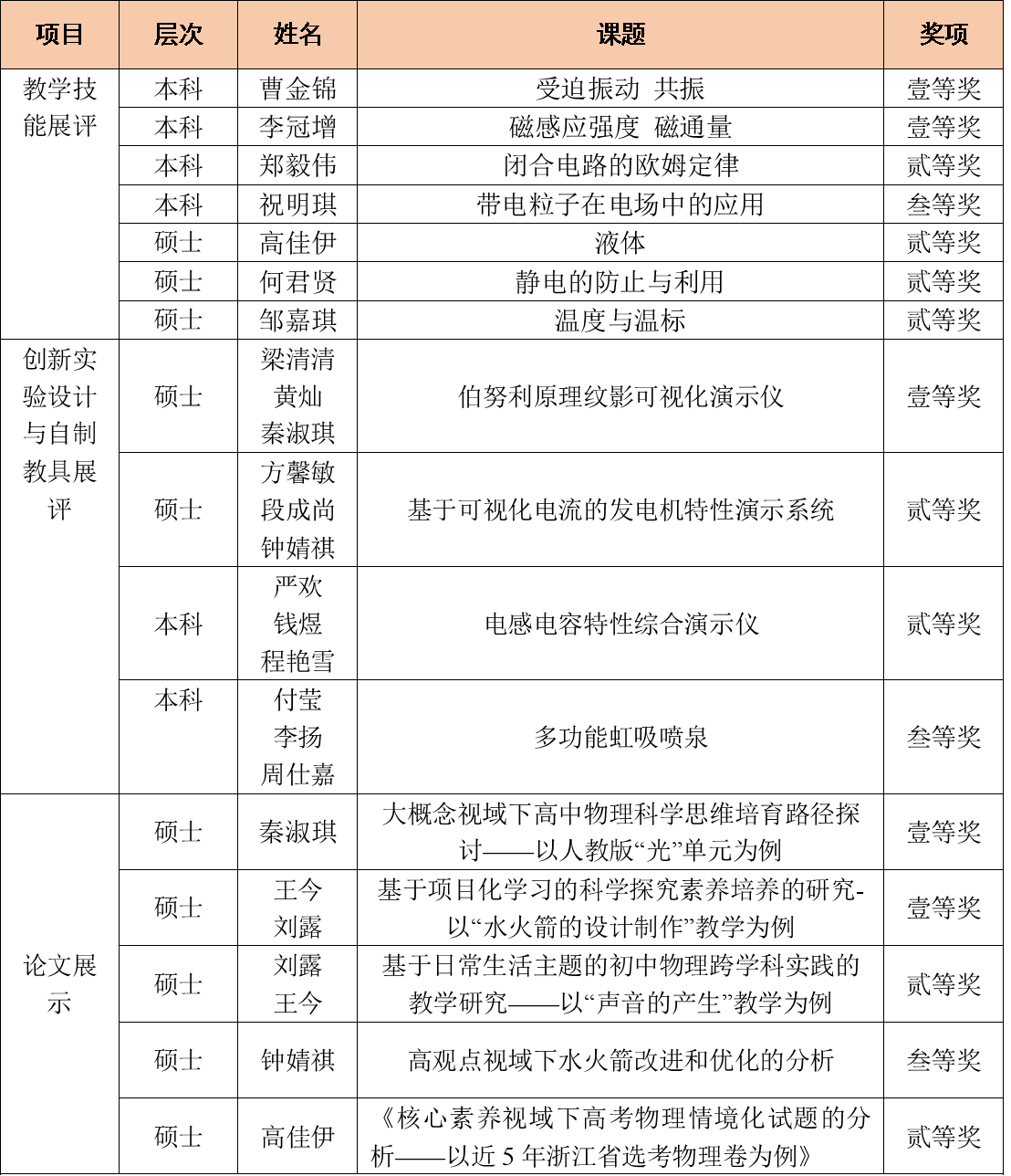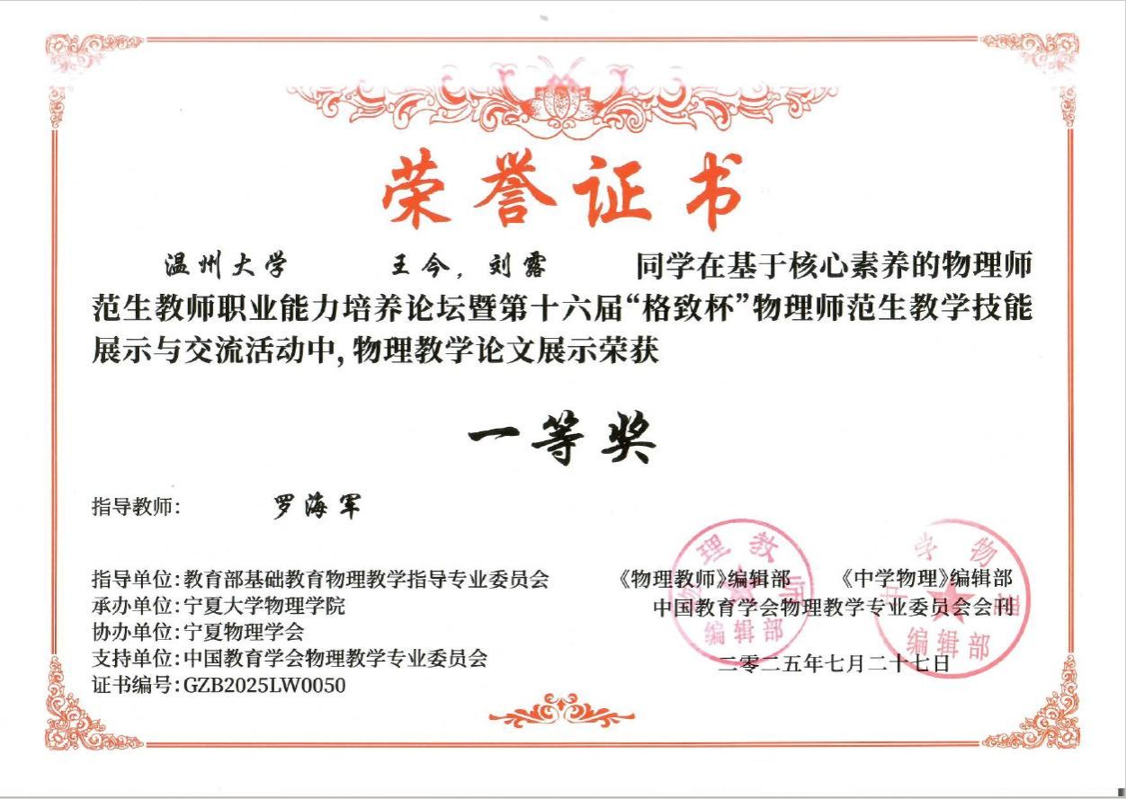 本届大赛由罗海军老师作为领队,黄晓虹、罗海军老师作为团队指导教师,集体为22物理的本科生,23和24的学科教学(物理)研究生进行教学技能、创新实验设计和论文展示等三方面的辅导。本科组中,黄晓虹老师指导的22物理的曹金锦、李冠增同学获得教学技能一等奖,郑毅伟、祝明琪同学分获教学技能二等奖、三等奖;罗海军老师指导的23物理的严欢、钱煜、程艳雪组获得教具创新实验设计二等奖,23物理的付莹、李扬、周仕嘉组获得教具创新实验设计三等奖。研究生组中,黄晓虹老师指导的何君贤、高佳伊、邹嘉琪三位同学获得教学技能二等奖;罗海军老师指导的梁清清、黄灿、秦淑琪组和方馨敏段成尚钟婧祺组分别获得教具创新实验设计一等奖和二等奖;罗海军老师指导的王今、秦淑琪均获得论文展示一等奖,高佳伊、刘露获得论文展示二等奖,钟婧祺获得论文展示三等奖。