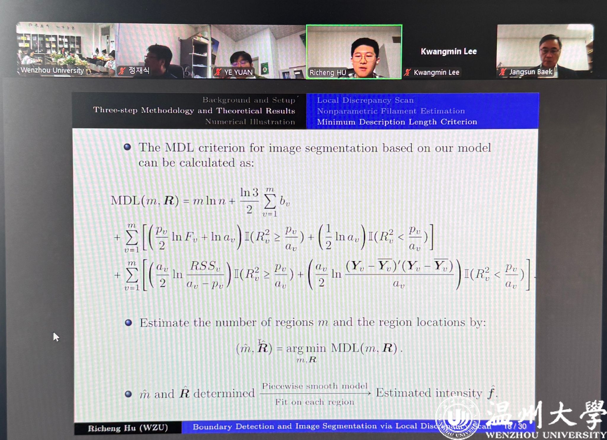 研讨会上,中韩双方教授、助理教授轮番登台,呈现了多场聚焦算法优化与实际应用的精彩分享。韩国全南大学Kwangmin Lee助理教授分享了反射哈密顿蒙特卡洛方法在有界域采样中的创新应用,为非凸、非光滑域采样提供了高效解决方案;Jaesik Jeong教授提出“双截断方法”,有效解决了尖峰零假设下局部错误发现率控制的虚假阳性膨胀问题。Jangsun Baek 教授聚焦异方差回归问题,提出基于扩散模型的去噪分数匹配新方法,规避了传统对数似然建模的不稳定性,提升了均值与协方差估计精度。3044永利胡日成助理教授汇报了基于局部差异扫描统计量的边界检测算法,在医学影像分析等领域展现出广阔应用前景;林峰助理教授聚焦分数阶偏微分方程求解,分享了次ordinator首达事件的快速精确模拟算法及蒙特卡洛近似解构建思路。报告环节后,双方师生就报告内容、学术疑点及应用前景等展开热烈交流,线上互动频繁、观点碰撞激烈。研究生们积极提问、踊跃交流,在汲取前沿知识的同时,也展现了扎实的学术素养与创新思维。