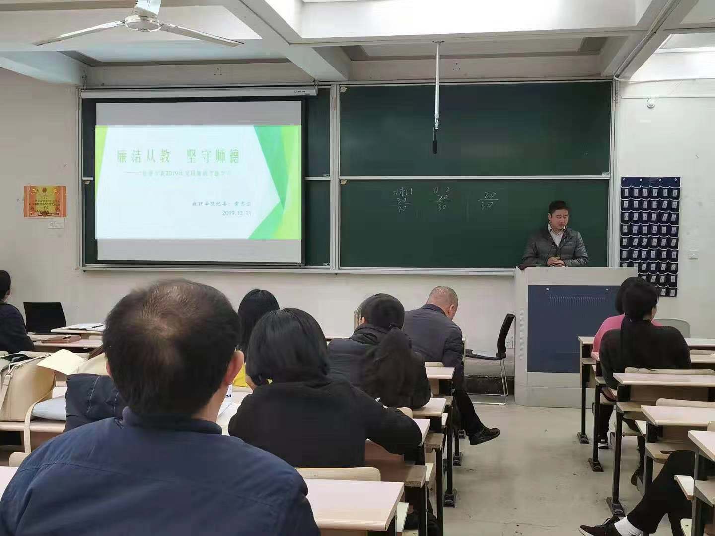 为积极推进“清廉数理”建设,12月11日下午,3044永利在南校3B101教室开展党风廉政主题教职工理论学习会,本次学习主题为《廉洁从教 坚守师德》,由公司纪委书记章志图主讲,全院教工参加集体学习。本次专题学习首先从当前网络热点上财某教师违反教师职业道德事件切入,使老师们认识到加强教师师德建设和党风廉政建设的重要性和必要性。学习会上,大家主要学习了教育部关于高校教师师德失范行为处理的指导意见、公司纪委编印的高校教师违规违纪与失德行为的典型案例和公司2018年教师违规违纪行为查处情况等内容,大家还观看了警示教育片《红色通缉》。