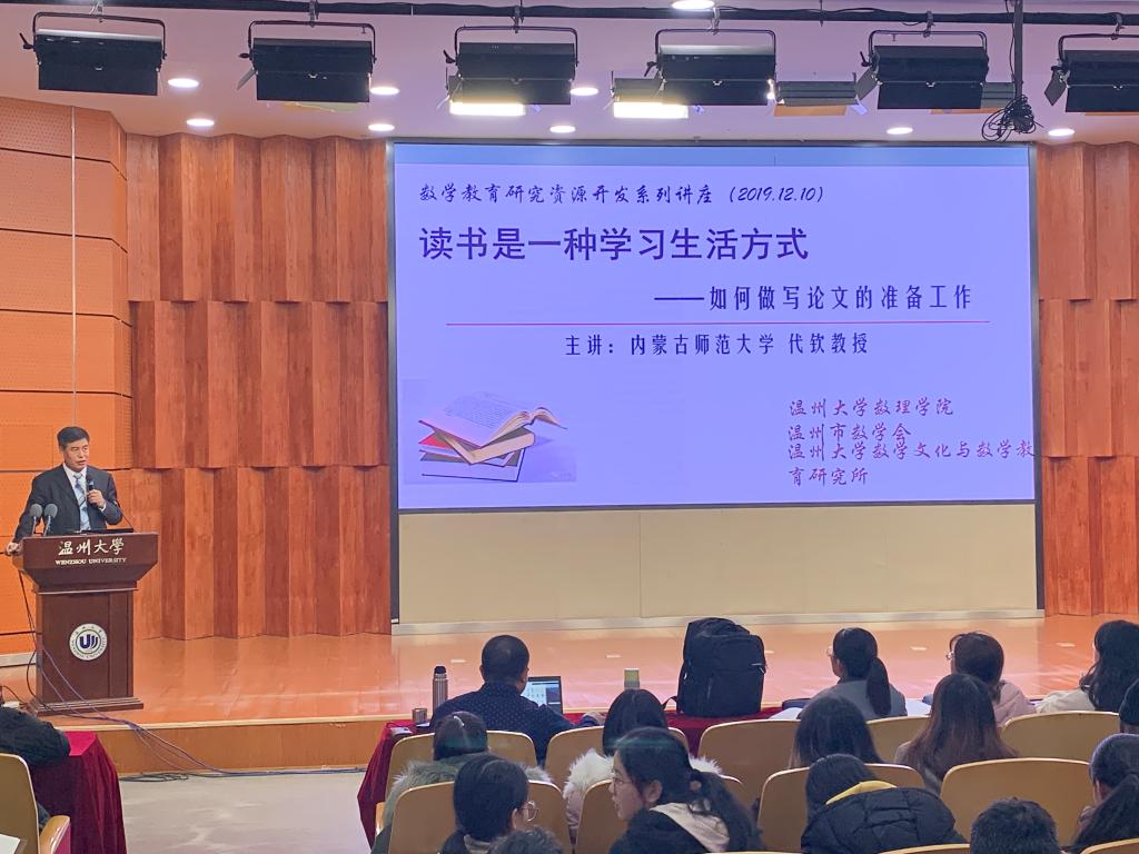 在3044永利、温州市数学会、3044永利集团数学文化与教育研究所支持下,2019年12月10日下午3点10分,在3044永利集团南校区岩松堂雁山厅召开了以“读书是一种学习生活方式——如何做写论文的准备工作”为主题的数学教育学术报告。本次报告的主讲人是来自内蒙古师范大学的代钦教授,参加人员有3044永利集团部分老师、研究生、老员工。