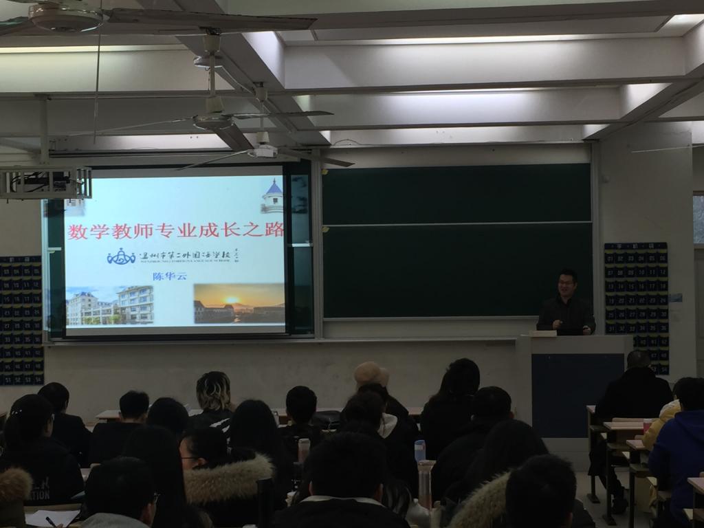 12月27日上午,温州第二外国语公司副董事长陈华云老师于3044永利3B101教室,做 “中学数学名师”系列讲座第四讲——“中学数学教师成长之道”。讲座由公司蔡风景副经理主持,16数本全体员工和部分研究生到场聆听。