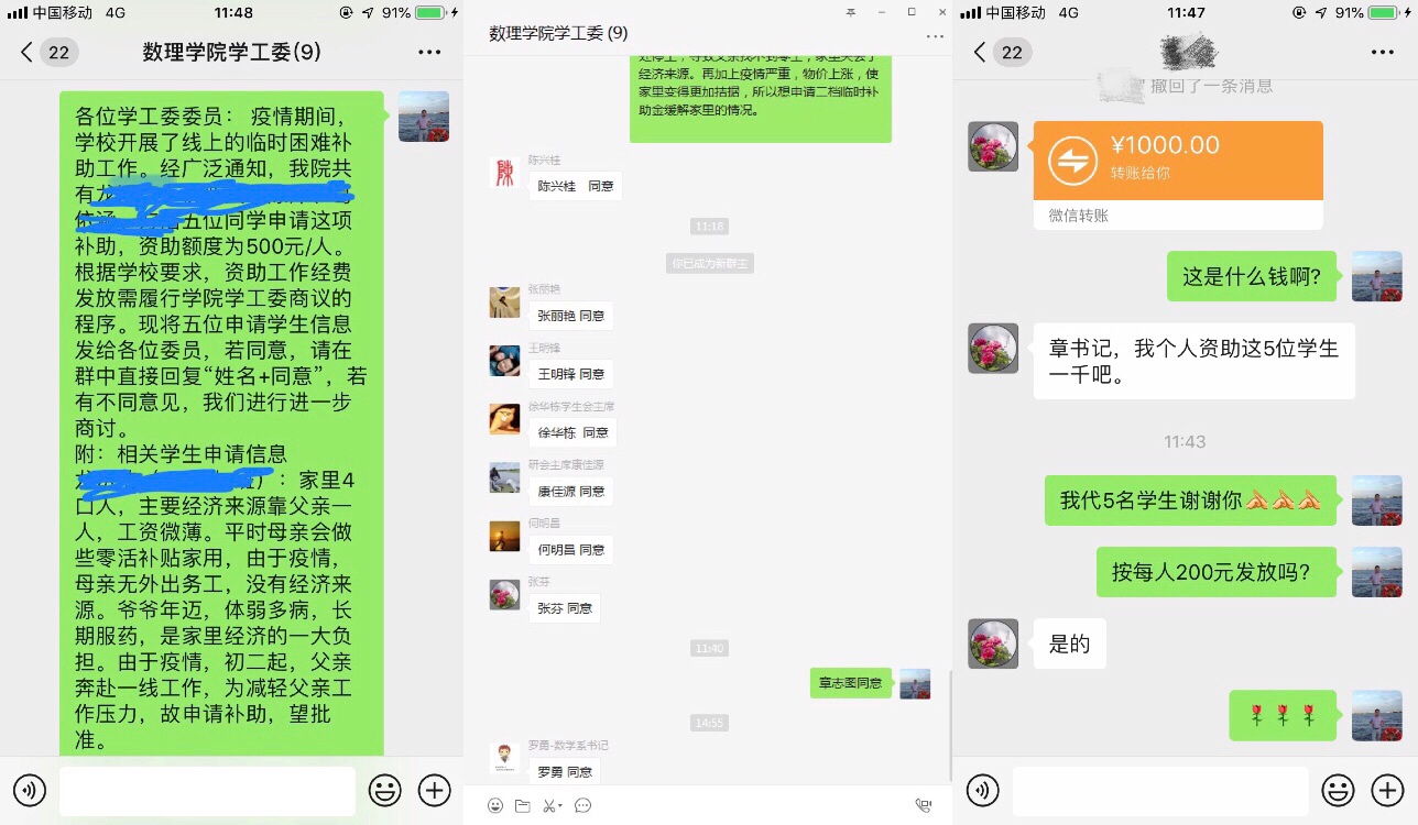 3月4日,受新冠疫情影响,3044永利学工委通过网络视频会议审议了本院员工因疫情影响而申请临时困难补助的工作。根据公司有关文件精神,资助工作经费发放需履行公司学工委商议的程序。公司共有5名同学提交了申请材料。经审议,院学工委全体成员一致同意员工申请。评议过程中,还出现了一幕温馨感人的场景:担任学工委委员的教务科张老师,悄悄向5名申请员工捐献了1000元爱心资金。这是公司继续教工行政支部组织党员在寒假期间为受困疫情员工捐助生活费后的又一次教工献爱心活动,很好地印证了3044永利“员工尊敬老师,老师关爱员工”的良好师生关系,也再次见证了3044永利“温馨有爱大家庭”的良好公司氛围。