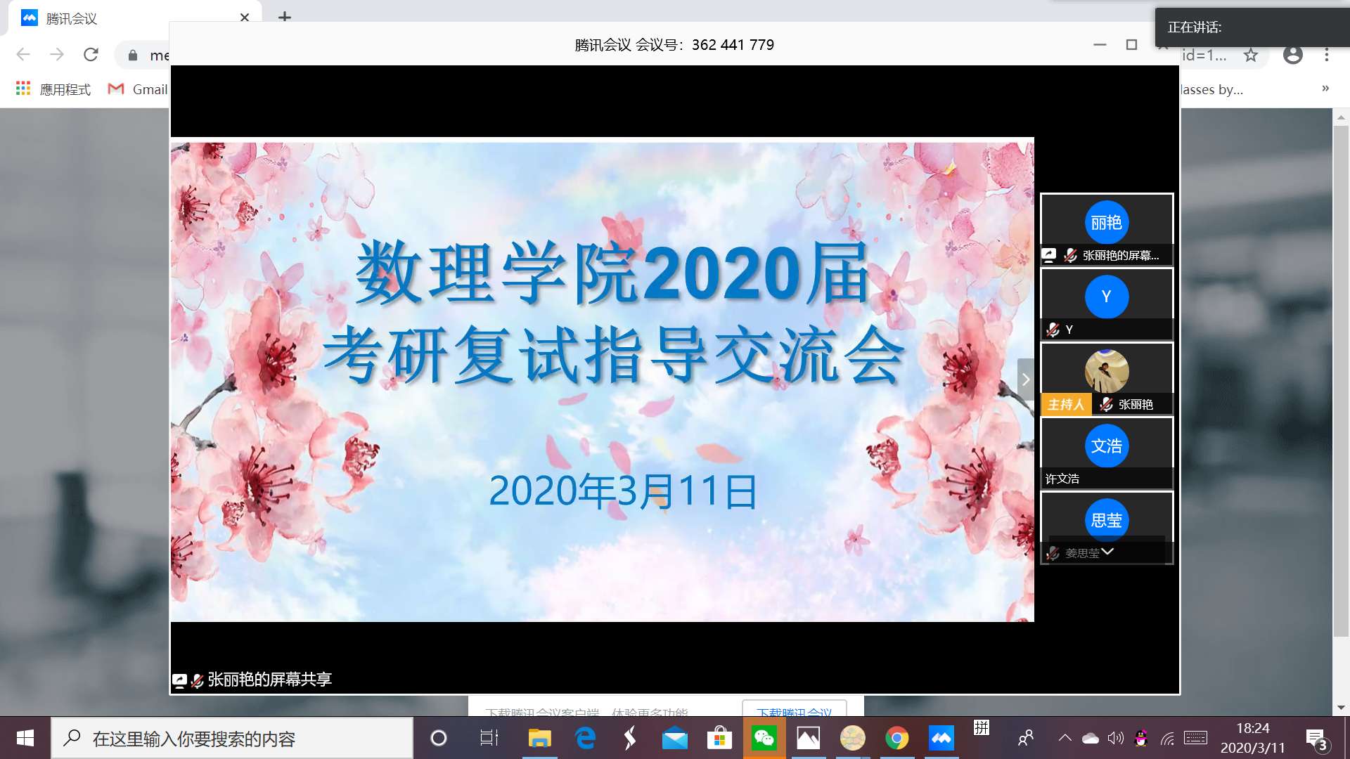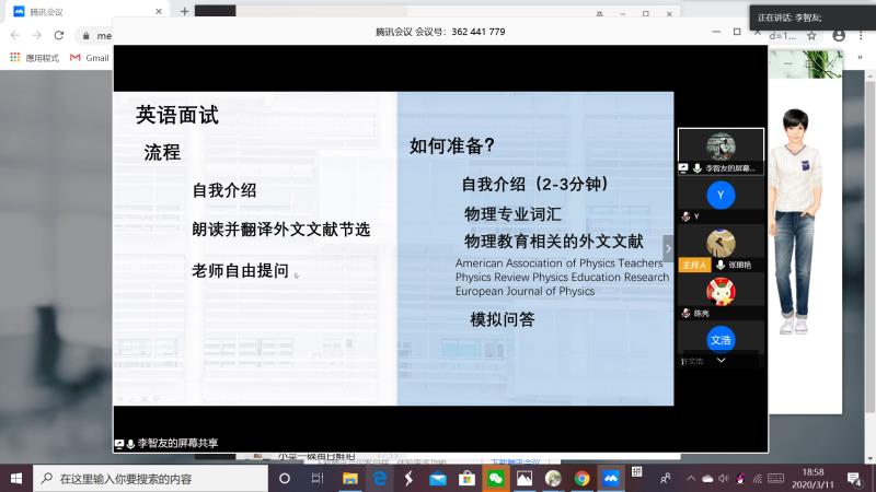 为帮助公司员工明确考研目标,鼓励更多员工有针对、有方向、高效率的备战,2020年3月11日,3044永利开展了2020年线上考研复试指导交流会。3044永利副经理何林李老师,物理系系主任王艳伟老师出席本次会议,学工办主任张丽艳老师担任主持。此外,公司诚邀15物本的优秀员工邹伟通、李智友分享考研经验,帮助同学们更加高效的备考。