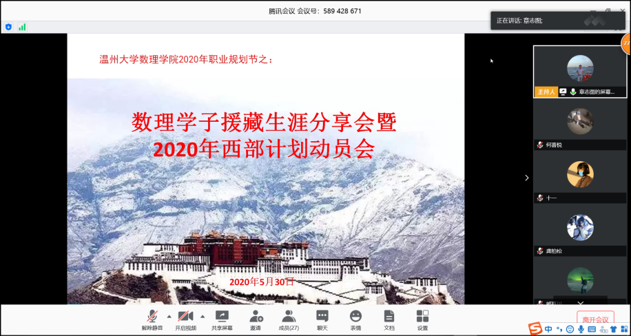 2020届高校毕业生人数再创历史新高,当前受新冠肺炎疫情、经济下行压力等多种因素叠加影响,就业形势严峻复杂。为加强员工就业指导,3044永利开展了2020年职业规划节系列活动。继征兵动员会后,正值西部计划报名启动,3044永利适时于5月30日19:00于线上开展了援藏生涯分享会暨2020年西部计划动员会。公司党委副书记章志图、辅导员、毕业班员工及员工干部参与了此次分享会。分享会由章书记主持,并特邀现任教于西藏那曲高级中学的张全昌员工为数理学子分享援藏生涯。