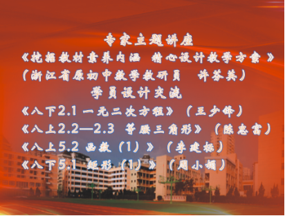 紧接着由郑银凤名师工作室的学员进行设计交流,由王少峰、陈忠富、李建标、周小媚四位老师分别分享八下2.1一元二次方程、八上2.2-2.3等腰三角形、八上5.2函数、八下5.1矩形的教学设计。