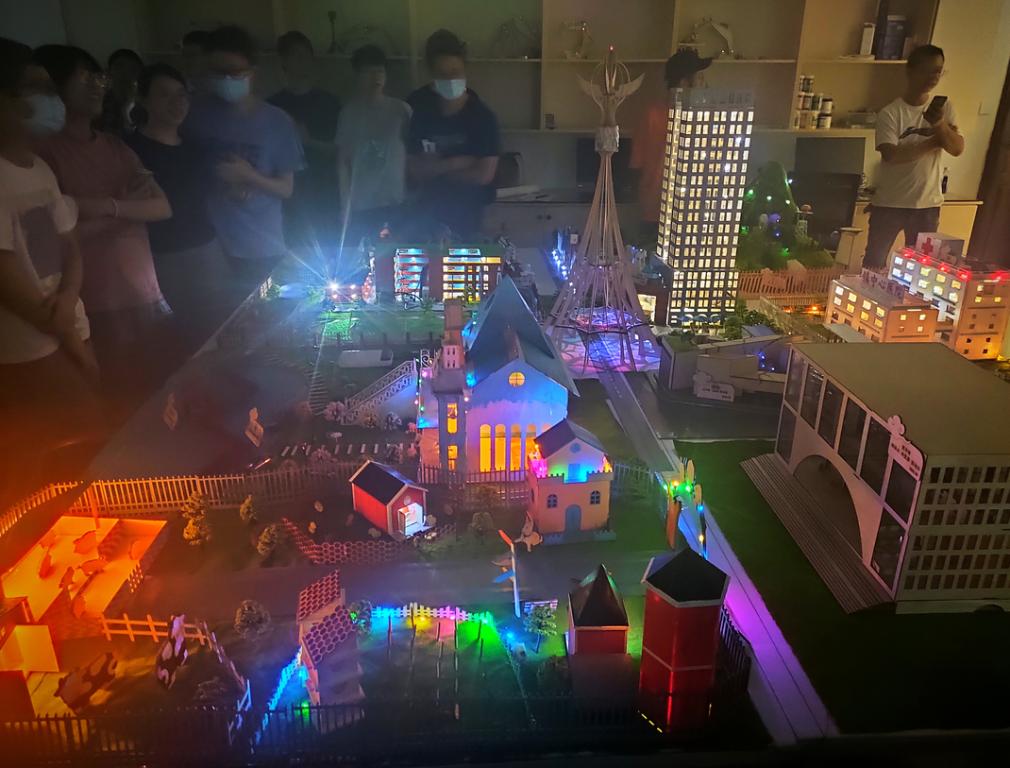 汇报开始后,各小组顺序上场进行展示,同学们简单介绍了在通用技术课程中的学习成果、实践体验、小组分工以及感悟体会。因为在作品设计和制作时倾注了大量的热情和心血,各小组成员在展示时显得格外积极自信。有同学说:“一开始连最基本的线条都不会画,后来居然能造一栋建筑出来”、“3DsMAX画图真的要像绣花一样有耐心”。汇报结束后,大家一起参观了“梦想小镇”。“夜晚”的小镇灯火通明,透过窗户,还能看到房子中的桌椅板凳。相信同学们收获的不仅仅是新技术,还有对自己的认可。