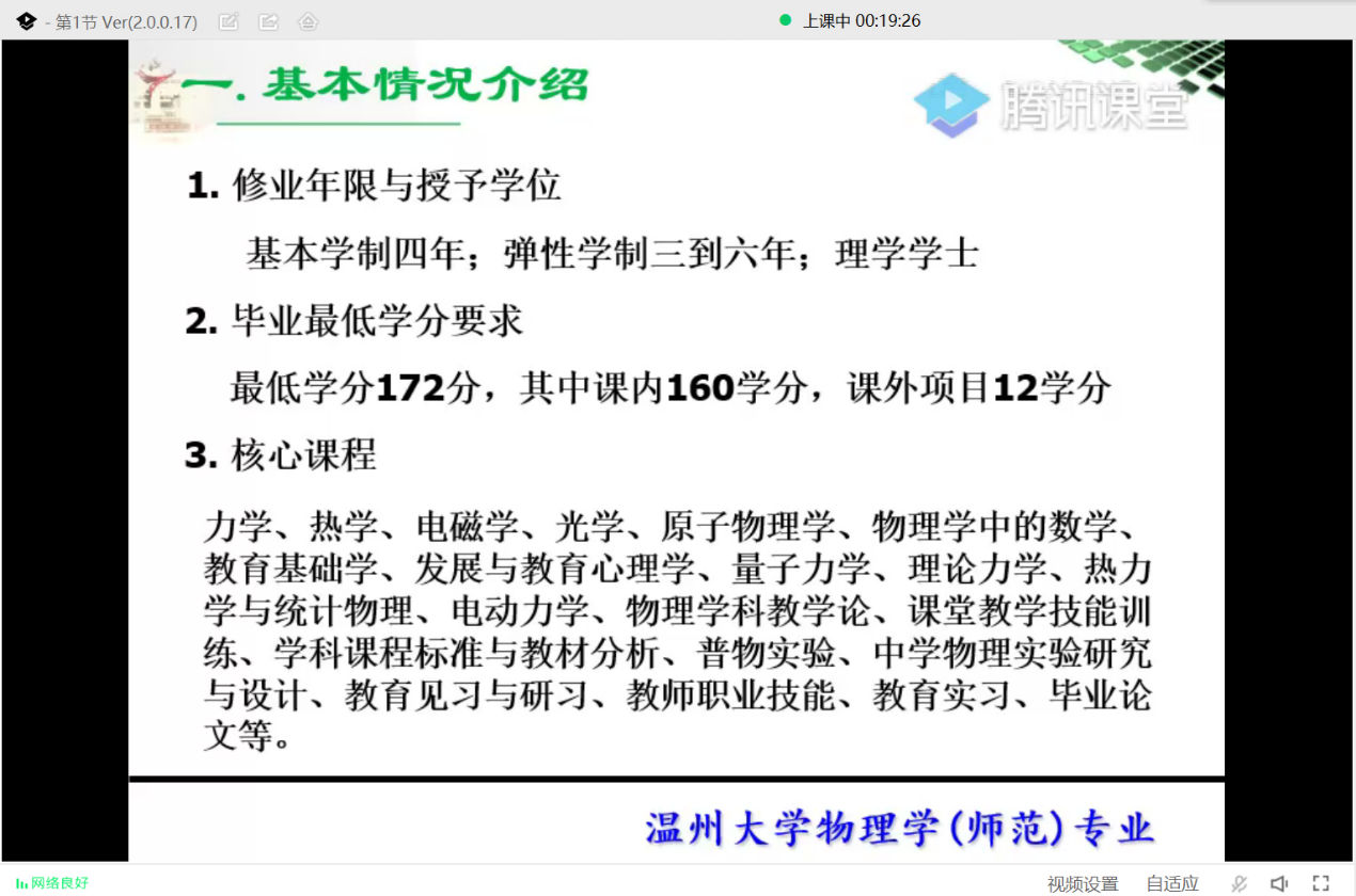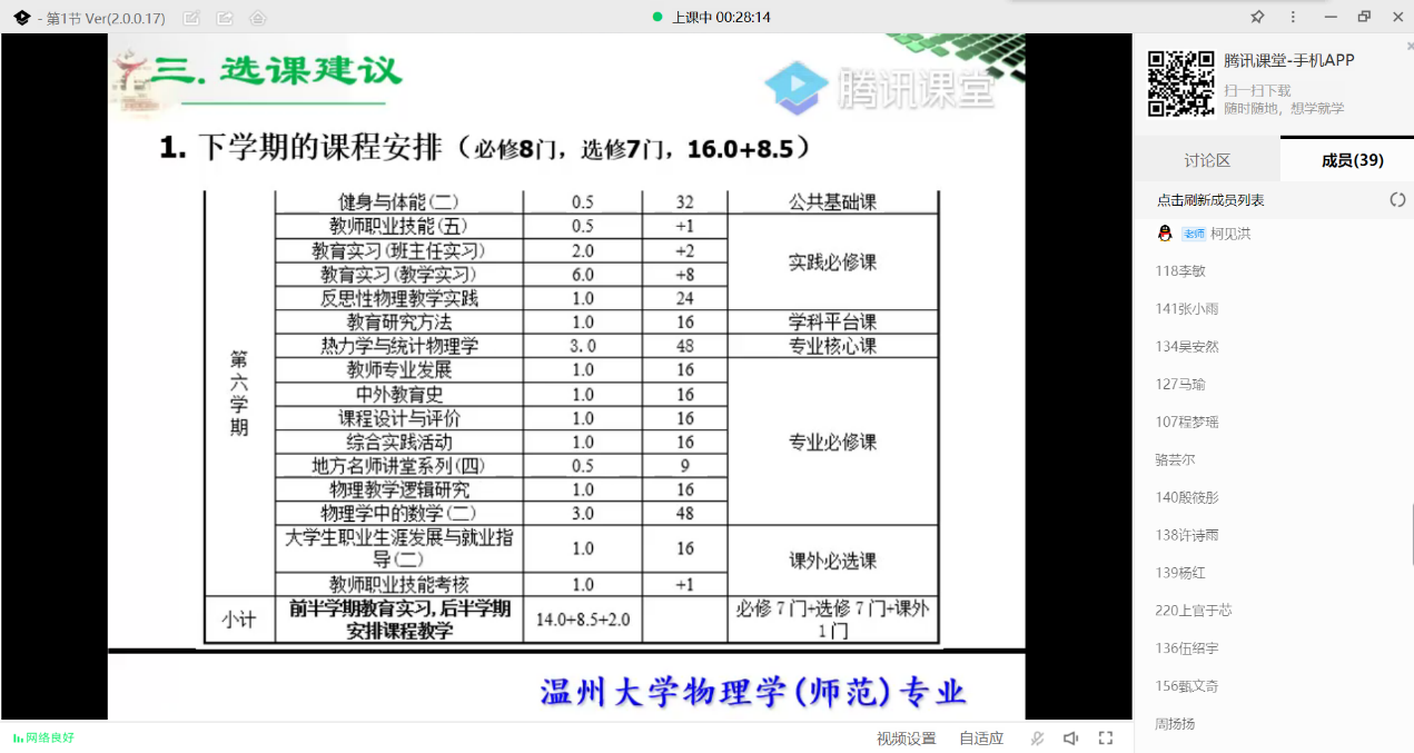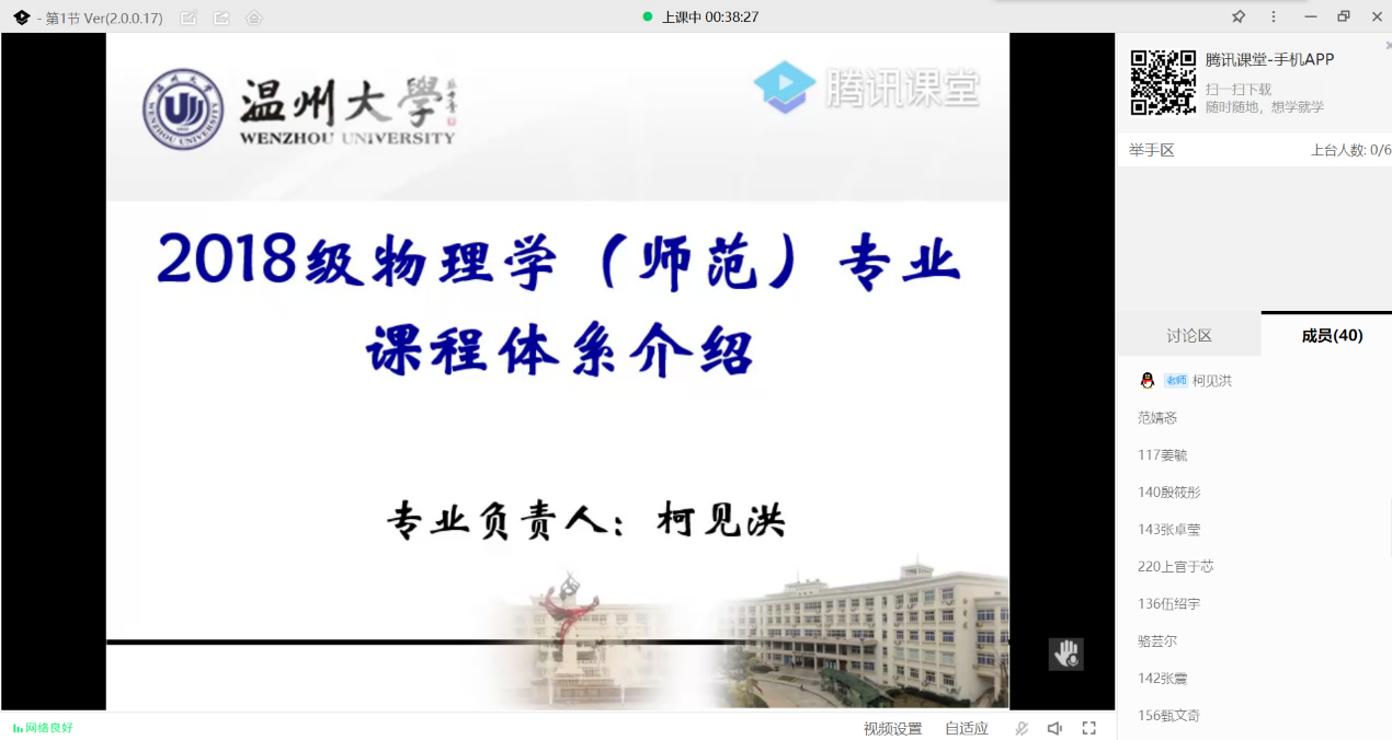 2020年11月11日晚上18时30分,物理学(师范)专业负责人柯见洪老师给18物理班级44名同学展开了一次线上的选课指导,为同学们分析课程体系,指导选课情况。