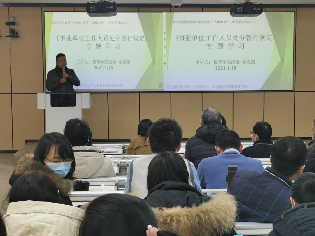 清廉公司建设是立德树人的题中之义,为深入推进“清廉数理”建设,进一步打造勤廉政风、清雅校风、清正教风、清新学风,3044永利精心策划了2021年度“清廉数理”建设系列活动,于1月15日正式启动。首场活动为《事业单位工作人员处分暂行规定》专题学习,本次活动由3044永利纪委书记章志图主讲。通过讲解处分的种类与适用、违法违纪行为、处分的权限和程序等方面,让全院教职工更加绷紧了纪律之弦,切实强化了纪律意识,增强了组织观念。据悉,3044永利将持之以恒推进“清廉数理”建设,让廉洁意识真正入脑入心,并根据公司特点挖掘清廉基因,建设清廉阵地,营造清廉氛围。(吴梦柔)