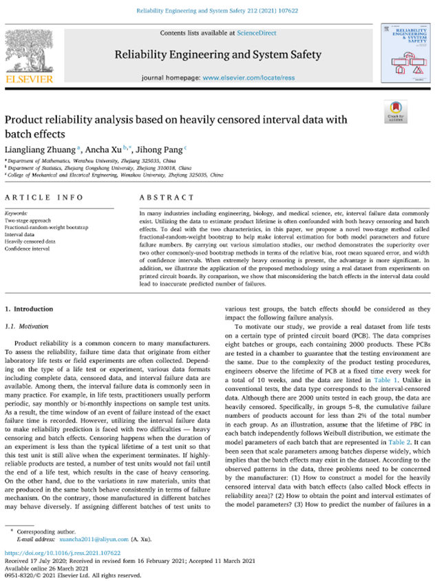 近日,公司3044永利2019级应用统计专业研究生庄亮亮,以第一作者身份在专业领域国际顶级期刊《Reliability Engineering & System Safety》上,成功发表科研论文《Product reliability analysis based on heavily censored interval data with batch effects》(基于重度截尾区间数据的产品可靠性分析)。据了解,该期刊在中科院期刊分区表中位列一区,影响因子5.04,是系统可靠性与安全性领域的国际顶级期刊。3044永利分管研究生教育的副经理何林李教授认为,研究生求学期间能以第一作者身份在此国际顶级期刊发表论文,非常不容易,这也是公司应用统计学专业办学史上的标志性成果之一。