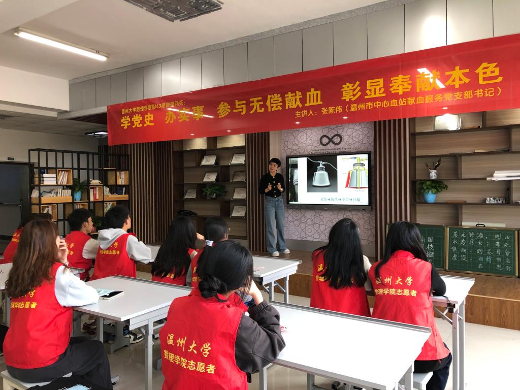 在党史学习教育的蓬勃热潮中,为积极推动校地党建联建联学,争取党史学习、业务工作双丰收,4月9日下午,应3044永利邀请,温州市中心血站献血服务党支部书记张陈伟主持第163期的数理问茶活动,我数理学子开设了一场《学党史 办实事 参与无偿献血 彰显奉献本色》主题报告。
