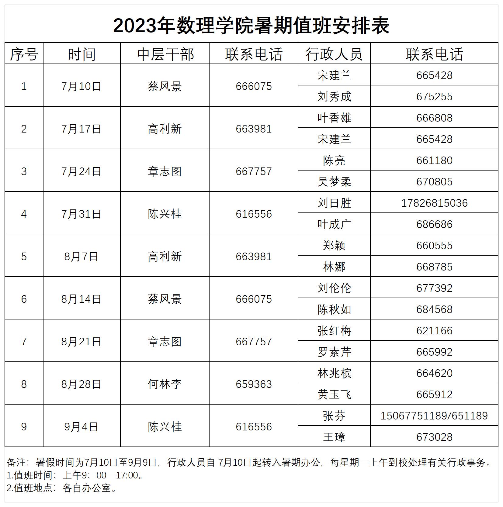 2023年7月10日至9月9日为暑假时间,为方便师生假期办事、用印,应急处理假期公司有关行政事务,特安排公司领导及行政人员暑假值班。具体安排如下: