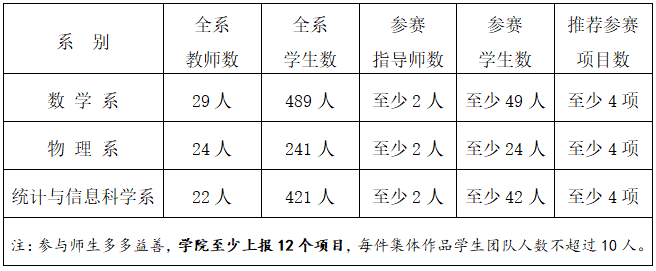 根据省赛、校赛文件精神,公司会严格考核公司师生参赛情况,并提出“参赛员工不少于全院员工数10%、指导师不少于全院教师数6%”的具体要求,现据此要求,将各系目标分解如下: