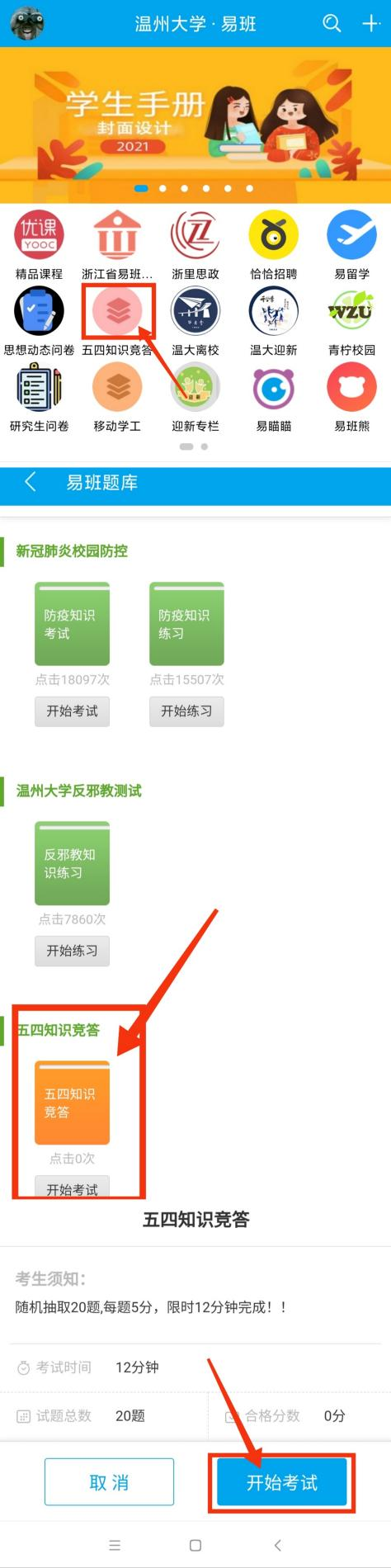 三、参赛方式:有意向参赛同学进入“易班”APP,点击“五四知识竞答”,即可开始练习或正式答题。