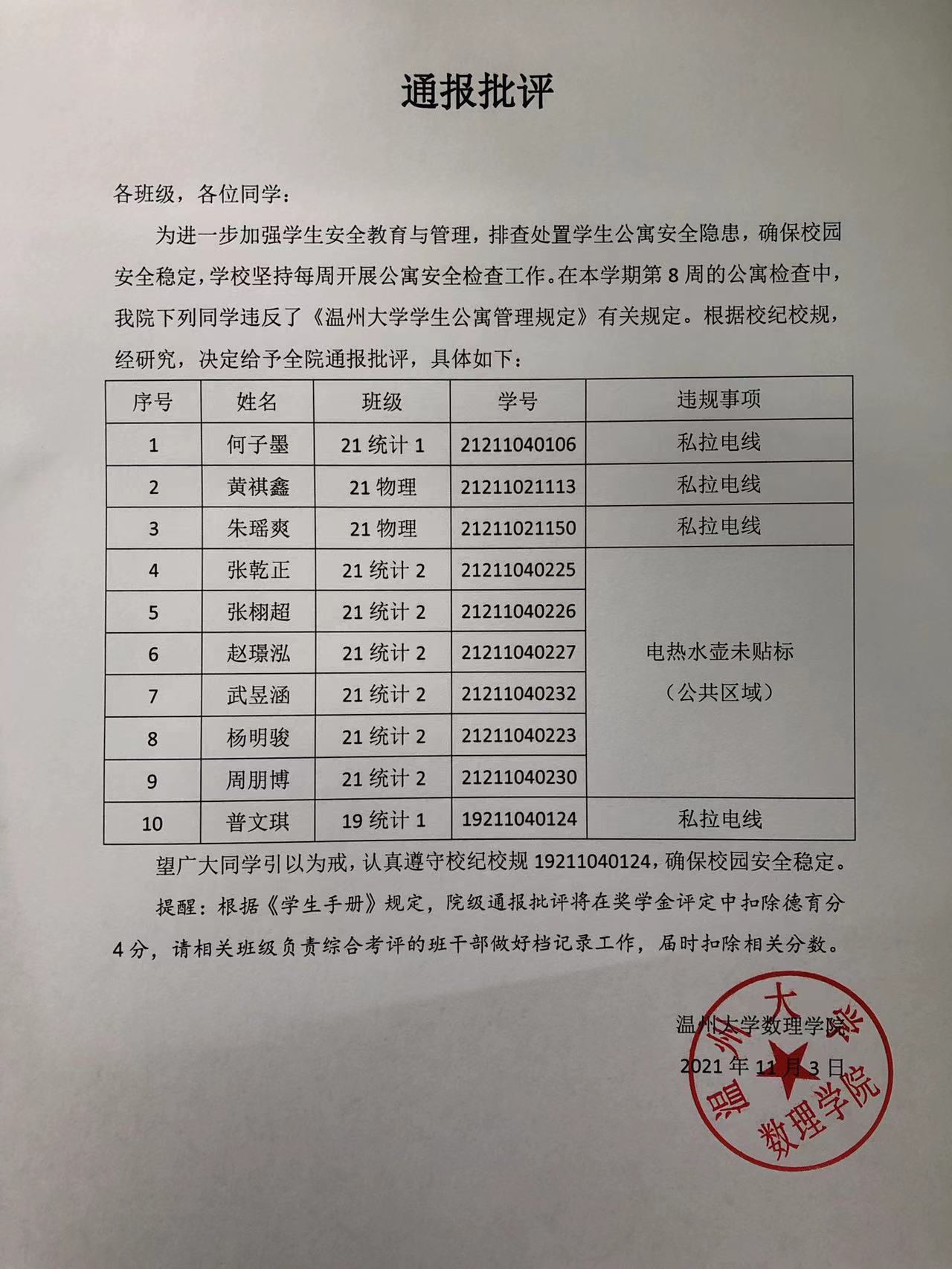 通报批评(校级,2021年10月27日)