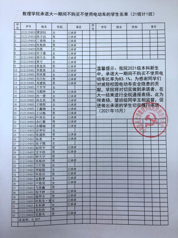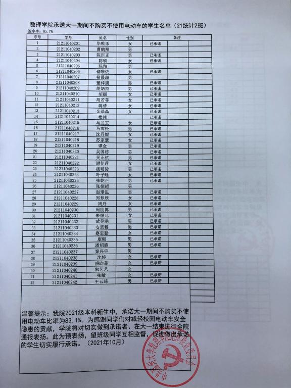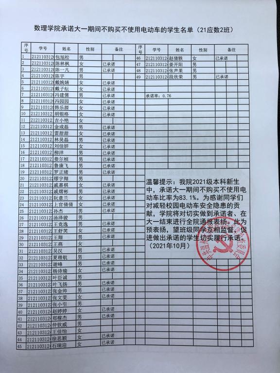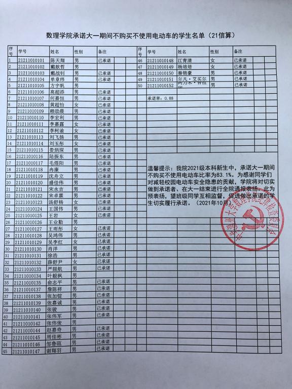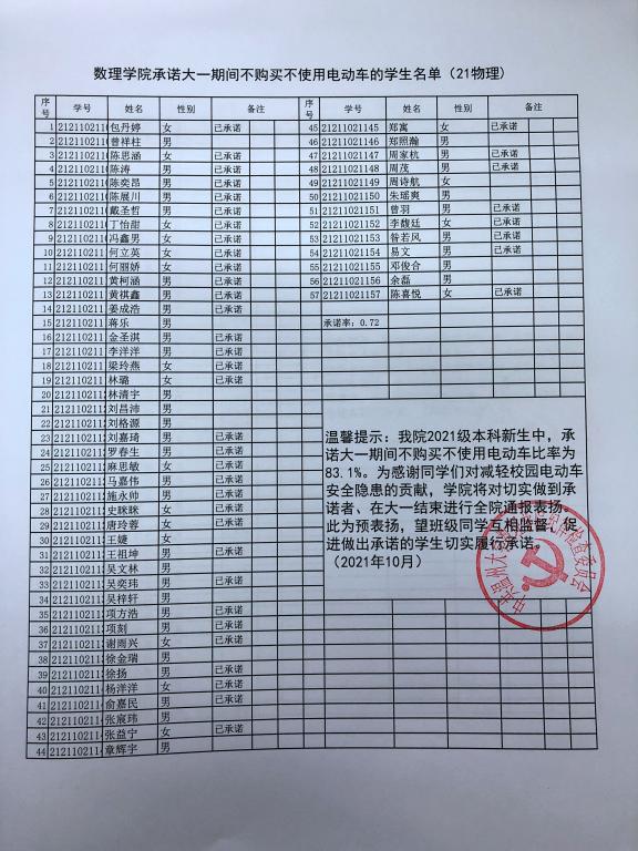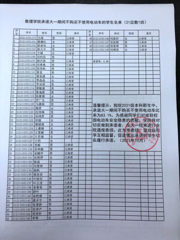 在公司2021级本科新生中,承诺大一期间不购买不使用电动车比率达83.1%。为表彰同学们对减轻电动车校园安全隐患的支持,公司将对切实做到承诺者、在大一结束进行全院通报表扬。此为预表扬,望做出承诺的同学坚持到底,切实履行承诺。